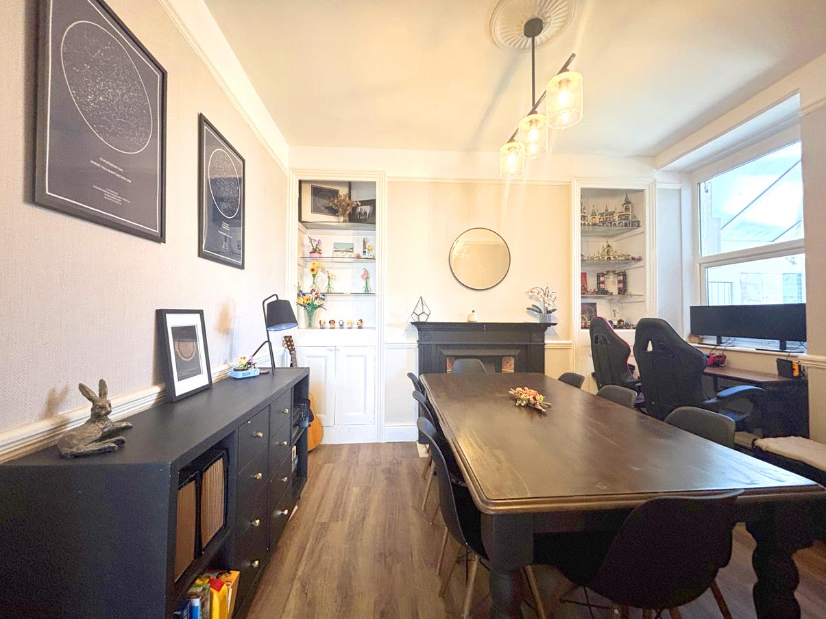 With a radiator, serving hatch to the kitchen. Borrowed light window to the utility room, decorative fireplace (not currently in use), with storage cupboards and open display shelving to the either side.