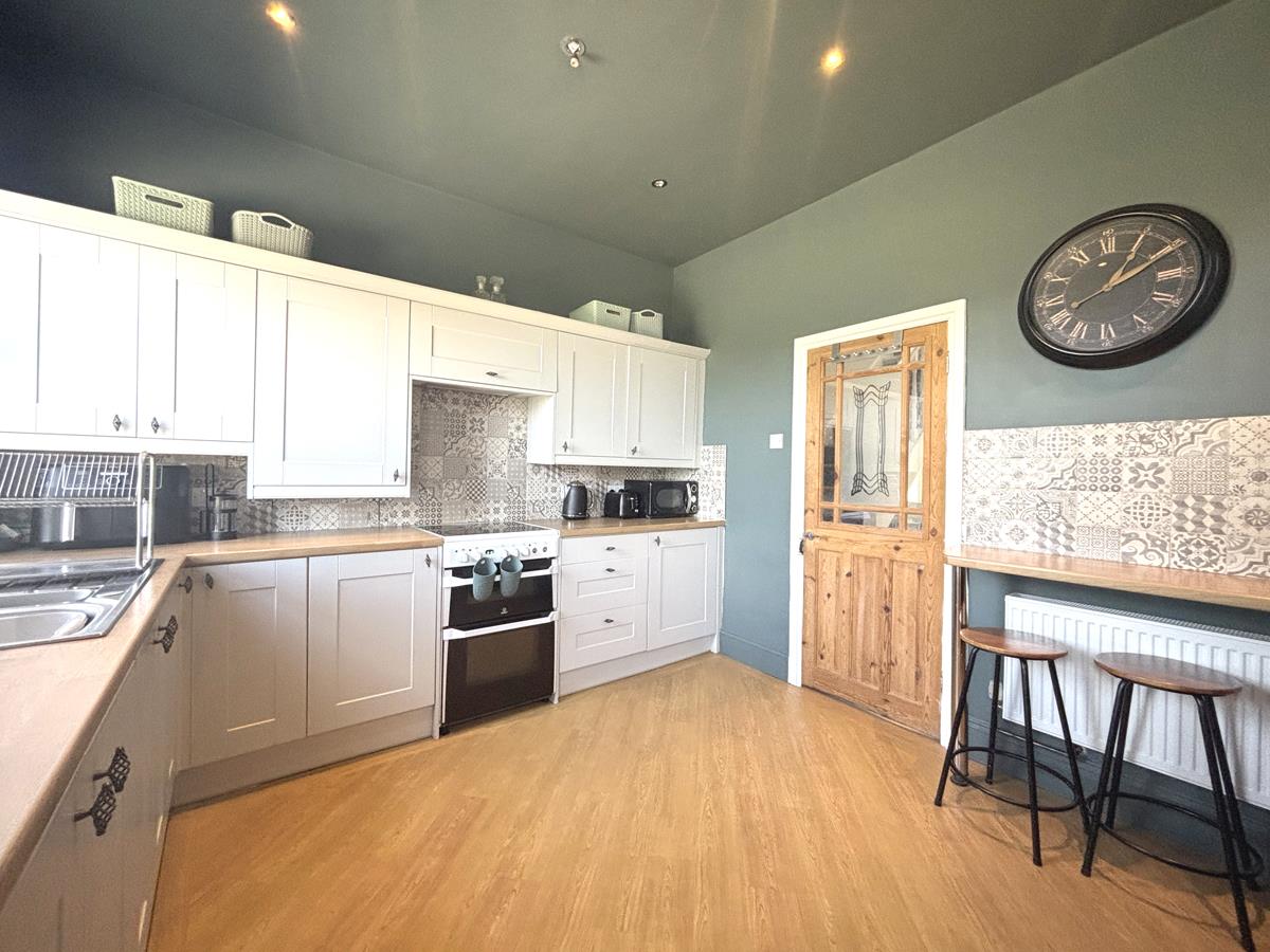 With a stylish pale grey shaker style kitchen comprising of a range of base and wall units, with rolled worktop surfaces over. One and a half bowl stainless steel sink and drainer with mixer tap and spray, electric cooker with filter and light over. A tiled splashback, space and point for an American style fridge/freezer. Breakfast bar, radiator, two windows to the rear and a door to the utility room.