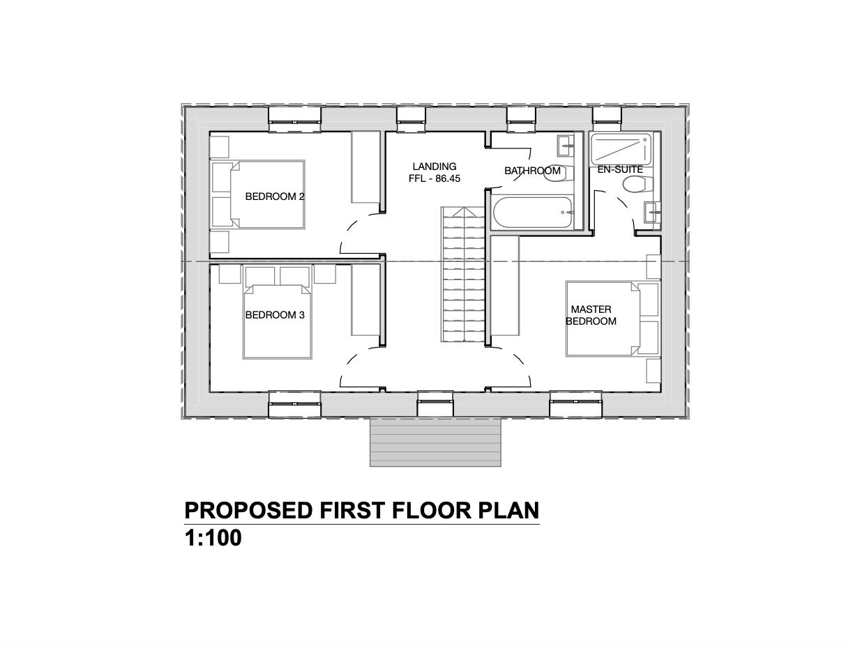 The outline plans are for a detached, two storey dwelling providing three bedrooms, the master of which has an en-suite shower room and the square meterage of the property, we are told, will total 101.85 metres squared.
