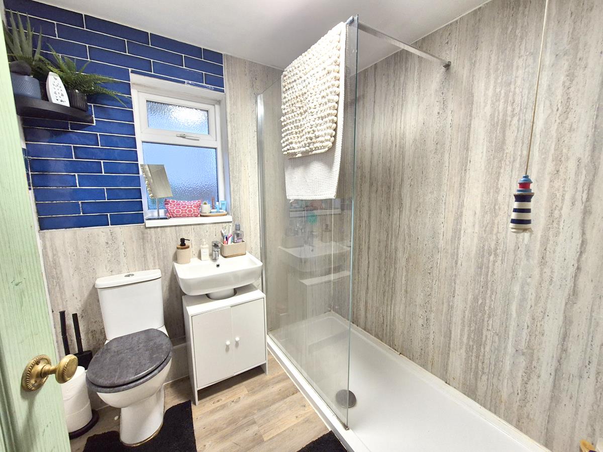 Comprising a walk-in shower, pedestal wash basin and a close coupled w.c. There are partially tiled walls and a frosted window to the side