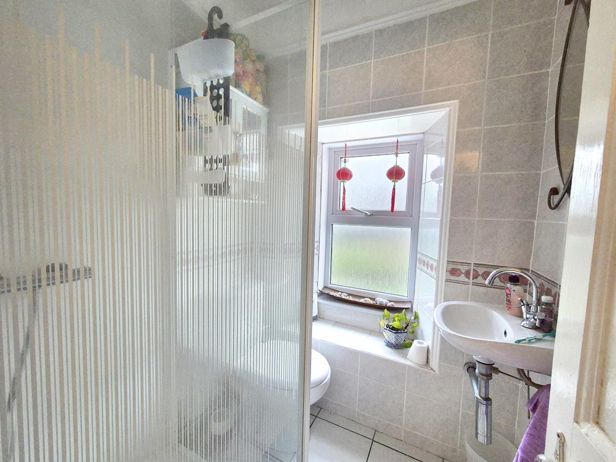 Comprising a shower cubicle, close coupled w.c. and wall mounted wash basin with mixer tap over. There is a tiled floor, partially tiled walls and a frosted window to the rear.