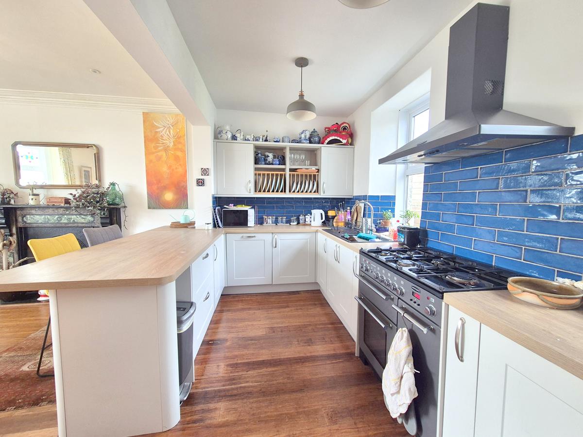 Comprising working top surfaces incorporating a one and a half bowl sink unit with drainer and mixer tap over. There are cupboards and drawers under and wall cupboards over. Built-in appliances include a dishwasher, space for a Rangemaster stove, with built-in hood over. Partially tiled walls and an outlook to both the conservatory and the rear garden.
