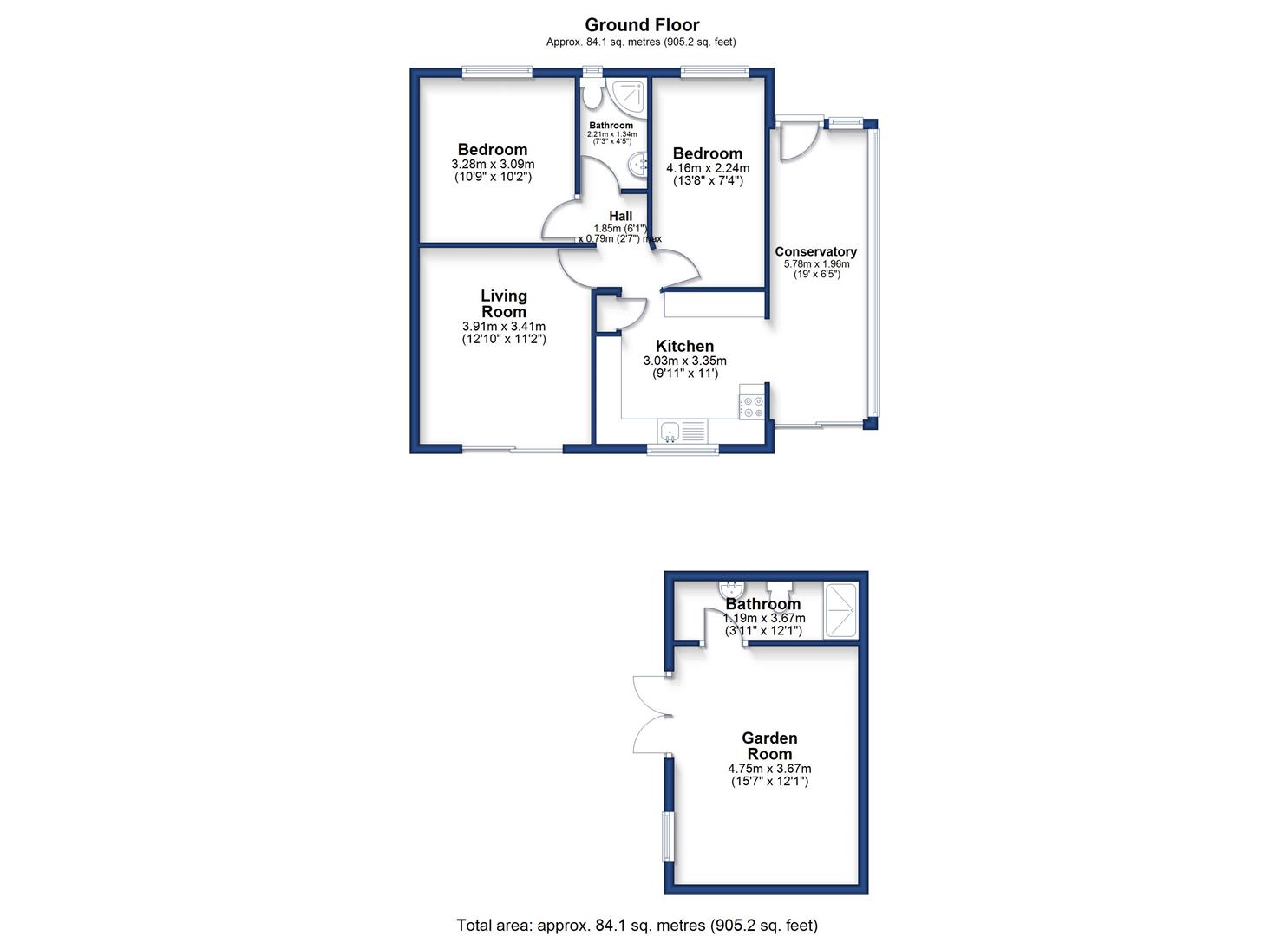 The accommodation in brief provides an entrance area/sun room, nicely fitted kitchen, two double bedrooms and a lounge with patio doors leading out on to the garden. To the outside there are gardens to the front and rear, the latter of which has a lovely garden room with shower room at the rear.