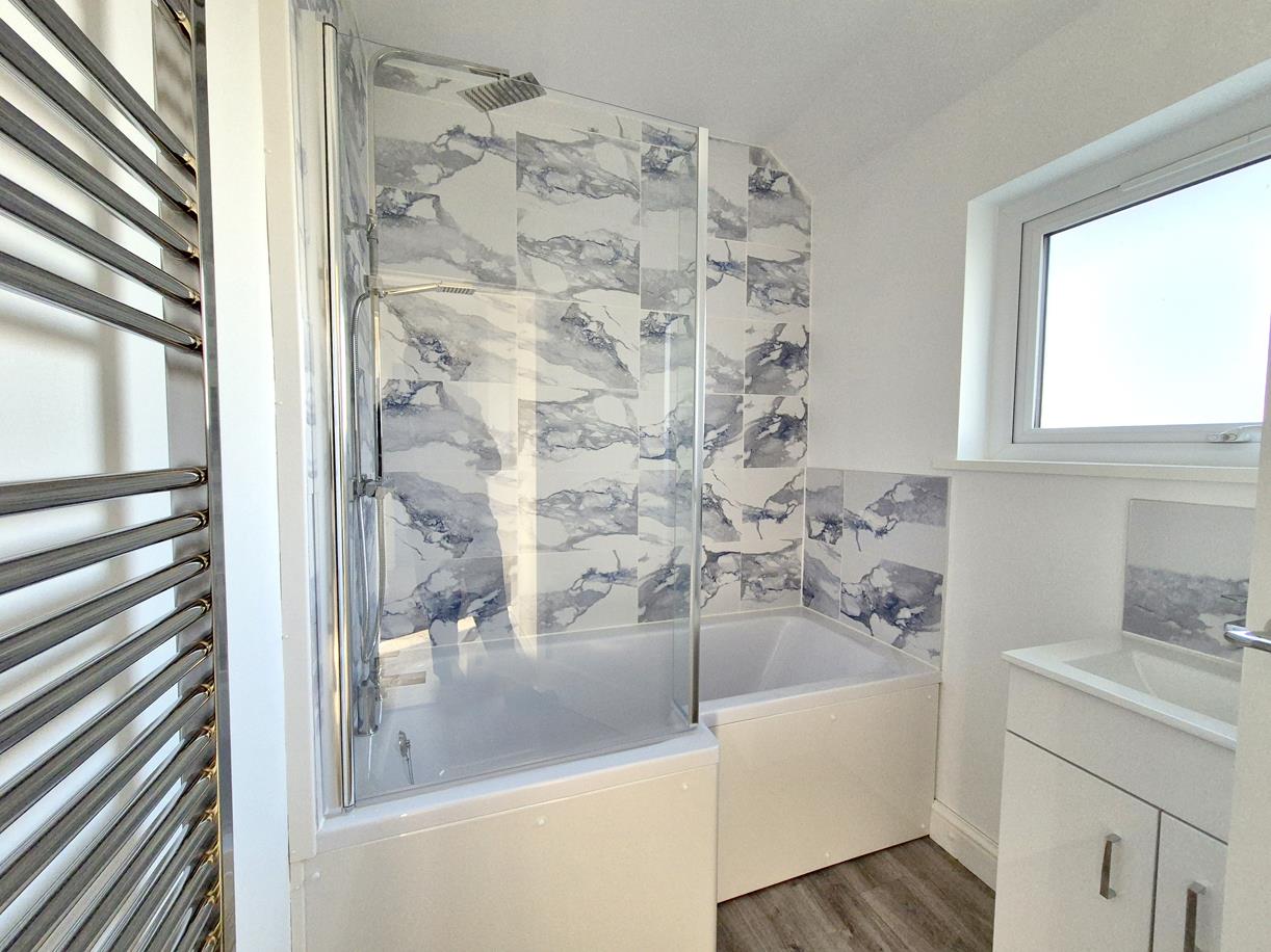 Comprising a W.C. with concealed cistern, wash basin with mixer tap over and cupboards under, peashaped bath with mixer tap and shower over with both rain and flexible shower heads. There is a frosted window to the rear.