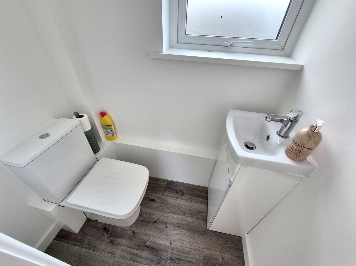 Comprising a close coupled W.C., wash basin with mixer tap over and cupboards under. There is a frosted window to the side.
