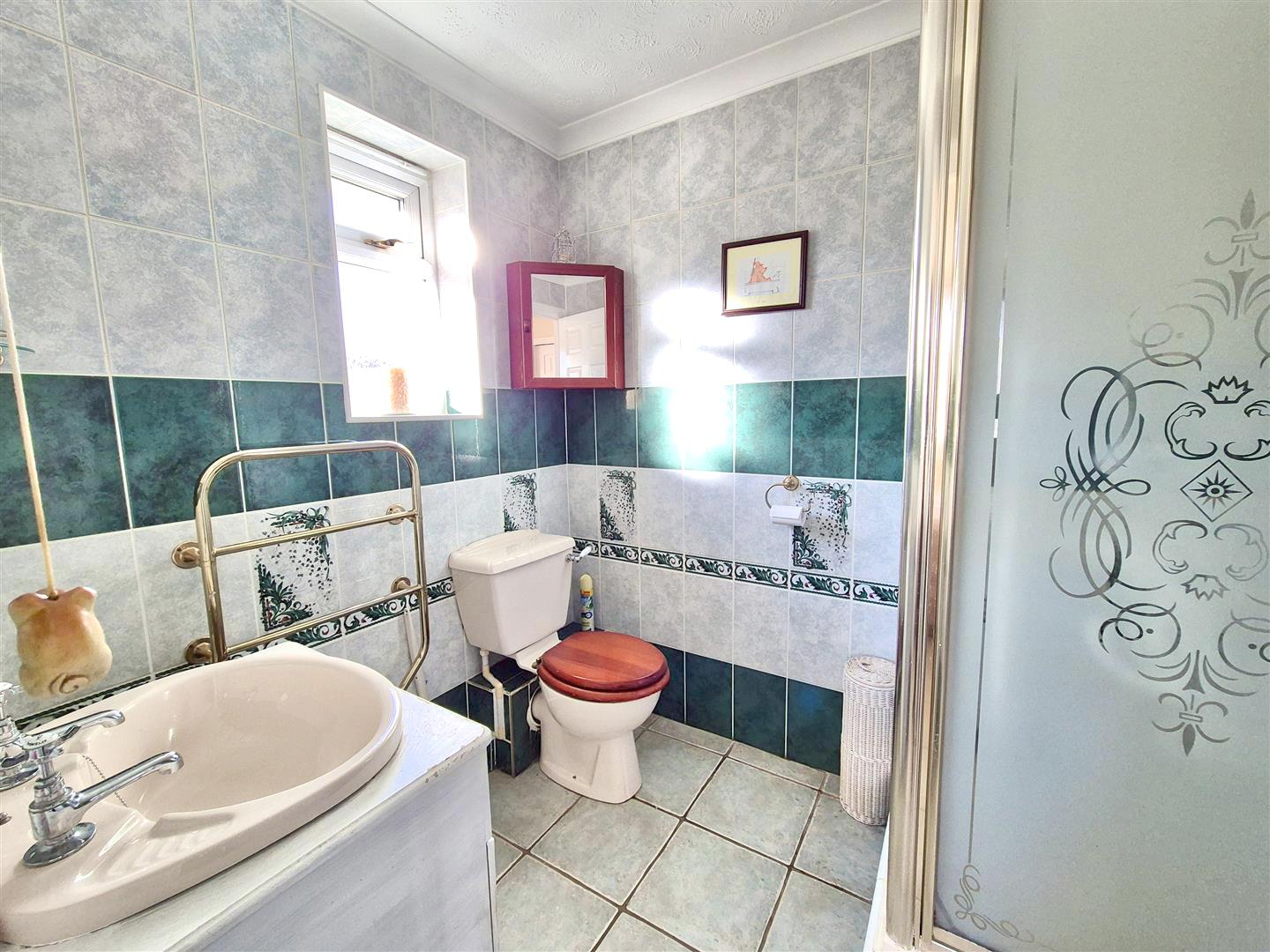 Comprising a shower cubicle, close coupled W.C. and a wash basin with surround and cupboards under. There is a tiled floor, tiled walls, heated towel rail and a frosted window to the side.