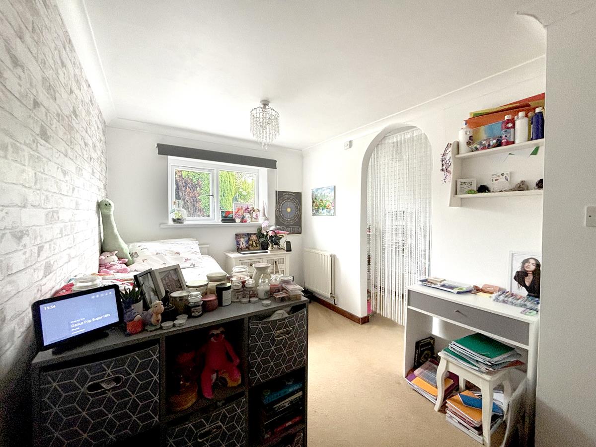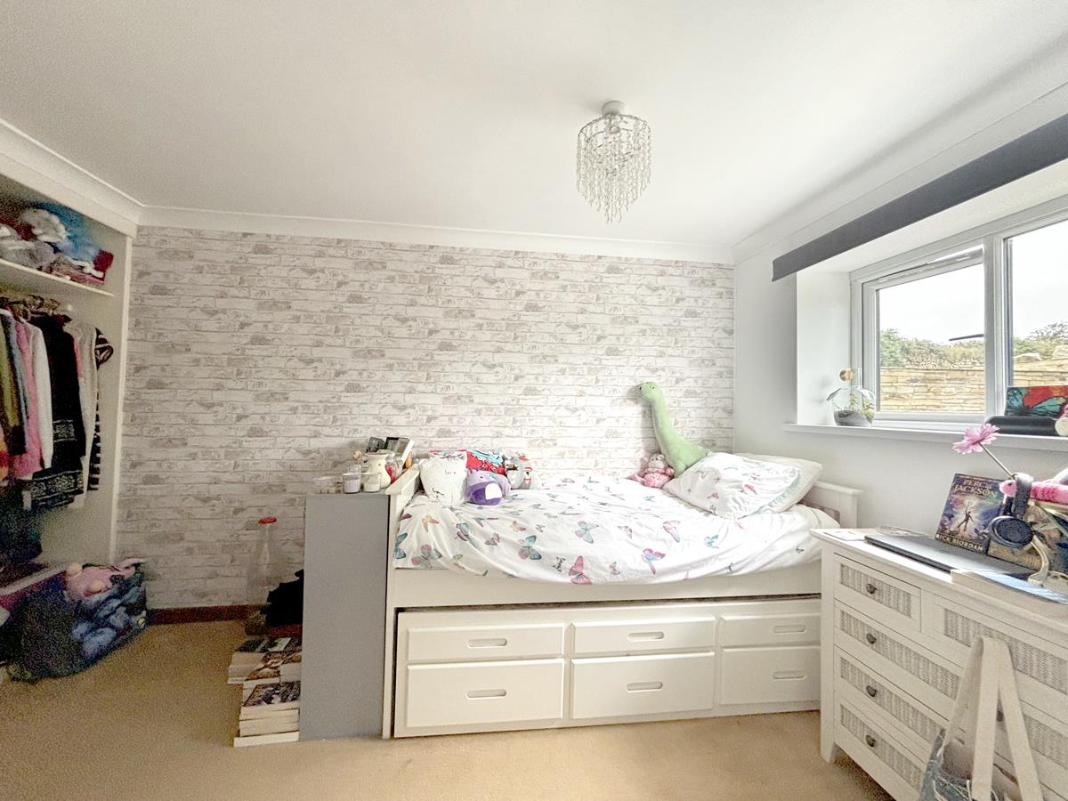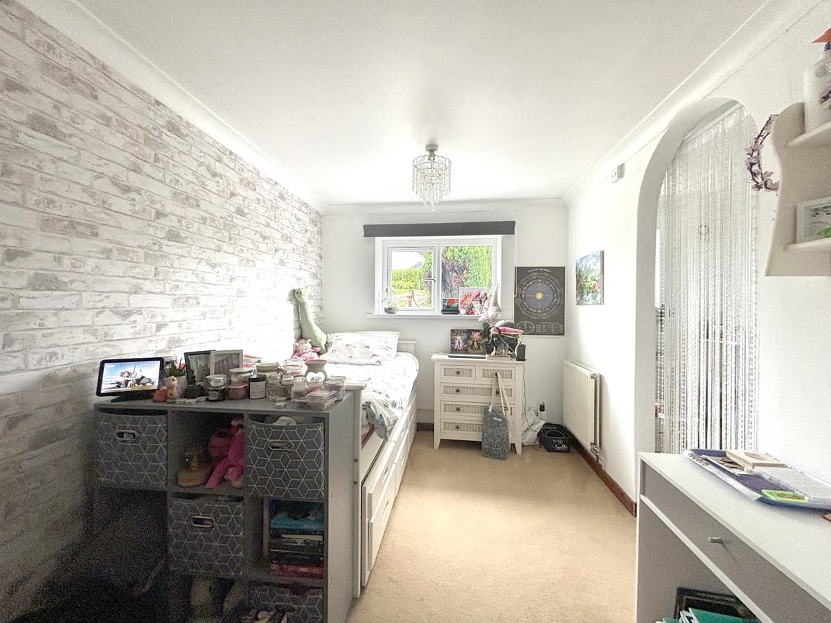 A dual aspect room with windows to the side and rear aspects with the window to the rear overlooking the garden and offering views to the coast and countryside beyond. Radiator and open built in storage providing for hanging space and shelved storage space.