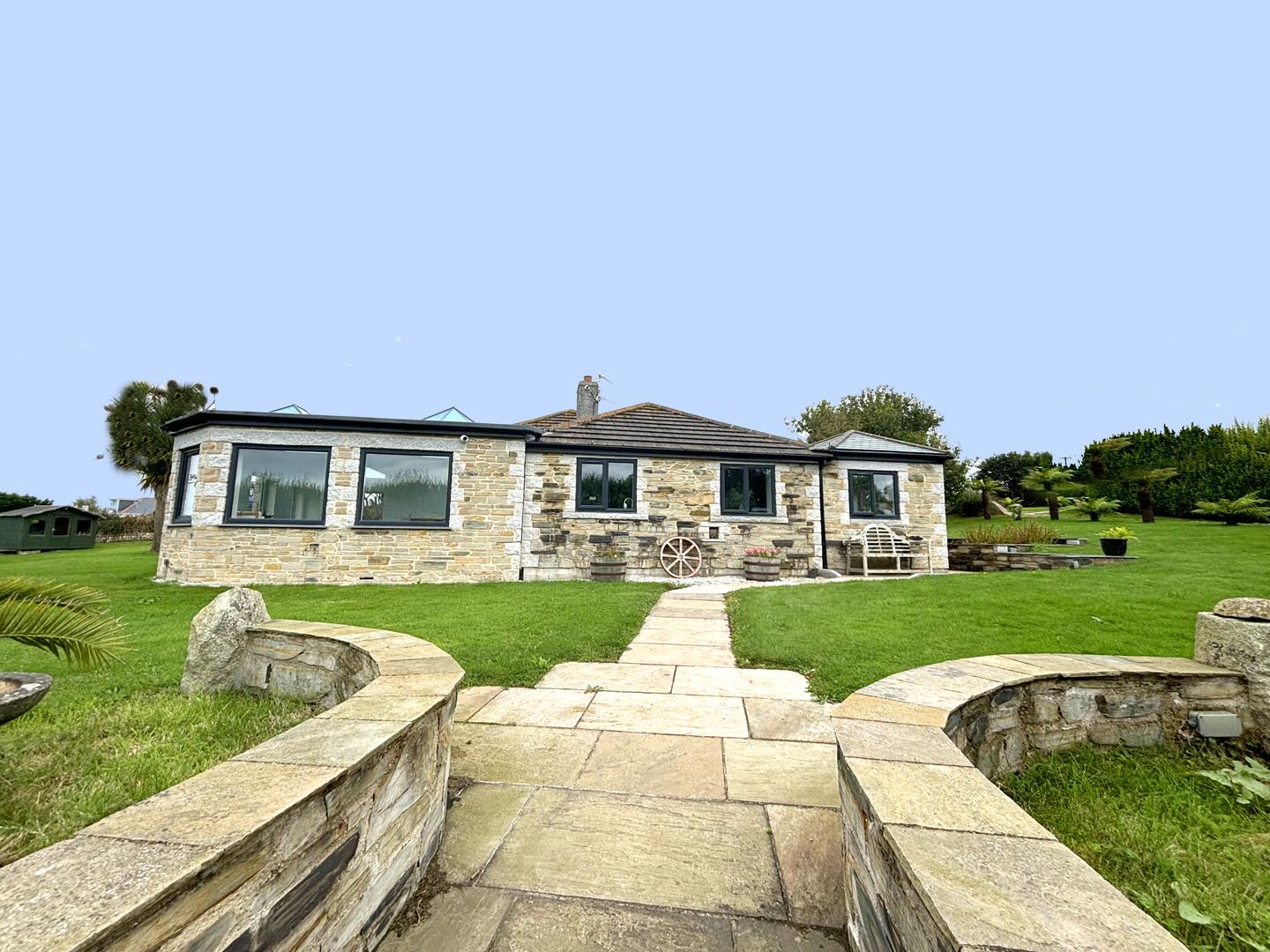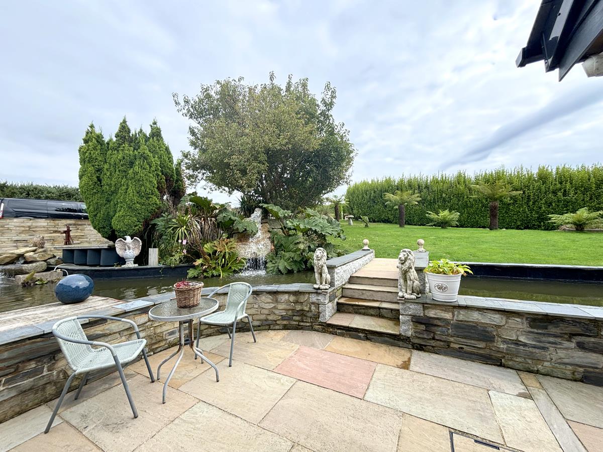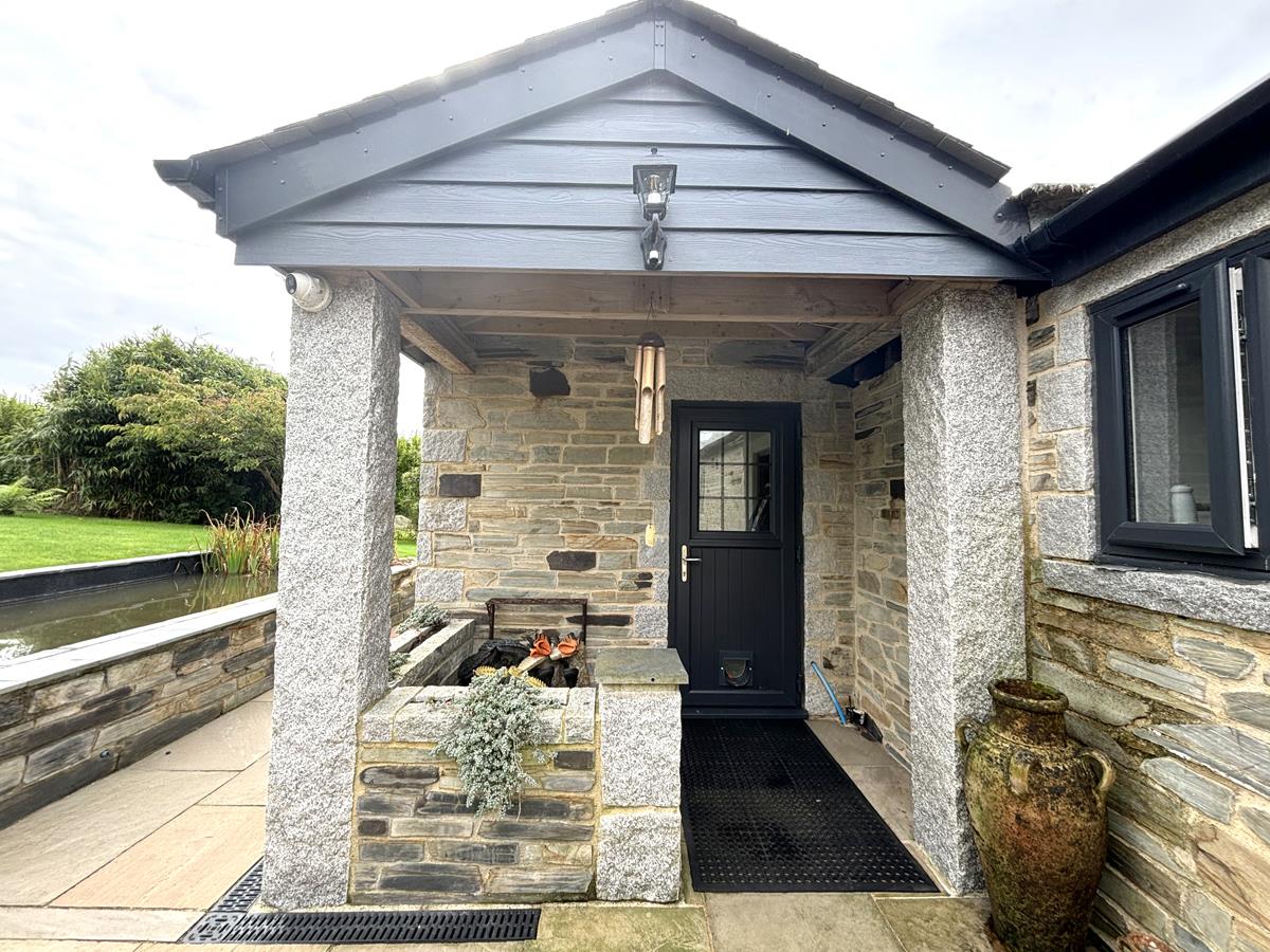 Arrive at the property via a timber five bar gate leading to the driveway, whilst to the right of the driveway is an expanse of lawn studded with ferns and a feature granite focal point. There are two parking areas providing off road parking for several vehicles. Follow the path to the front door passing a large feature pond with waterfall and central bridge leading to another area of lawn with established trees and ferns. A practical and attractive covered entrance with feature stone pillars leads to the front door.