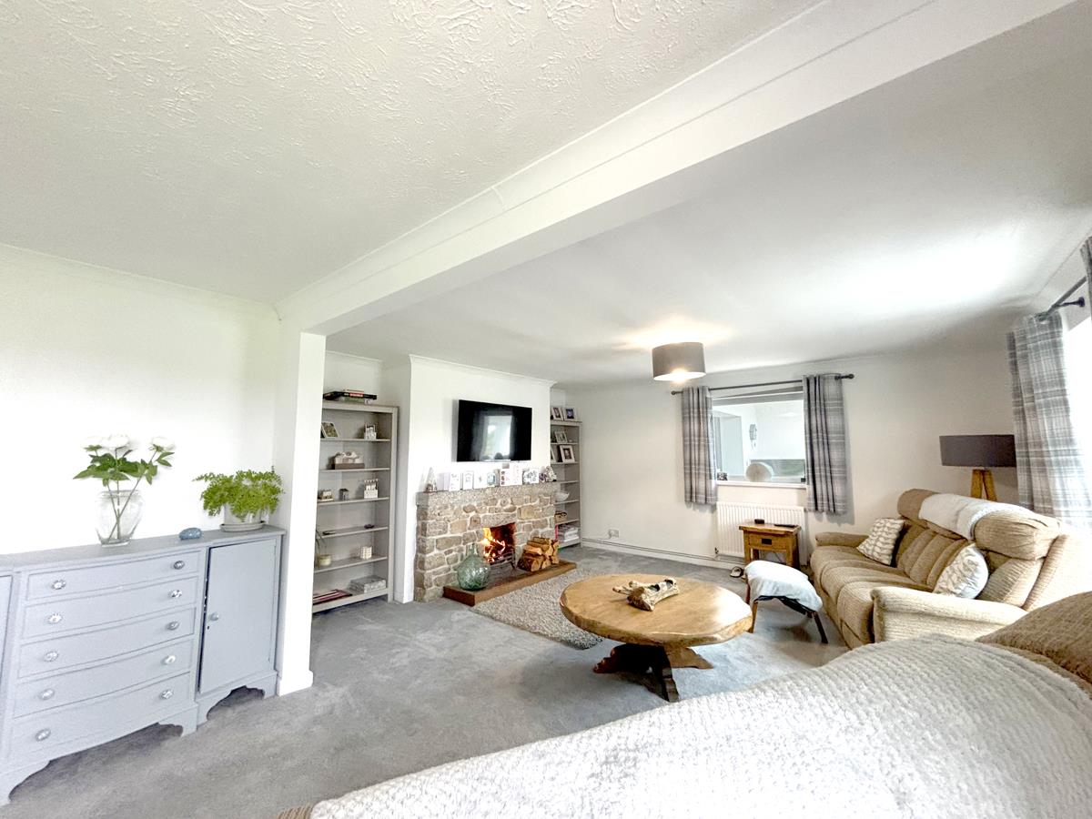 A spacious yet cosy room with borrowed light windows to the family room and sliding doors accessing the family room. There is an open fire, two radiators and stairs to the first floor.
