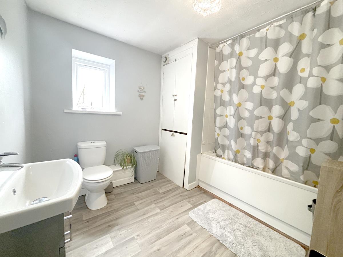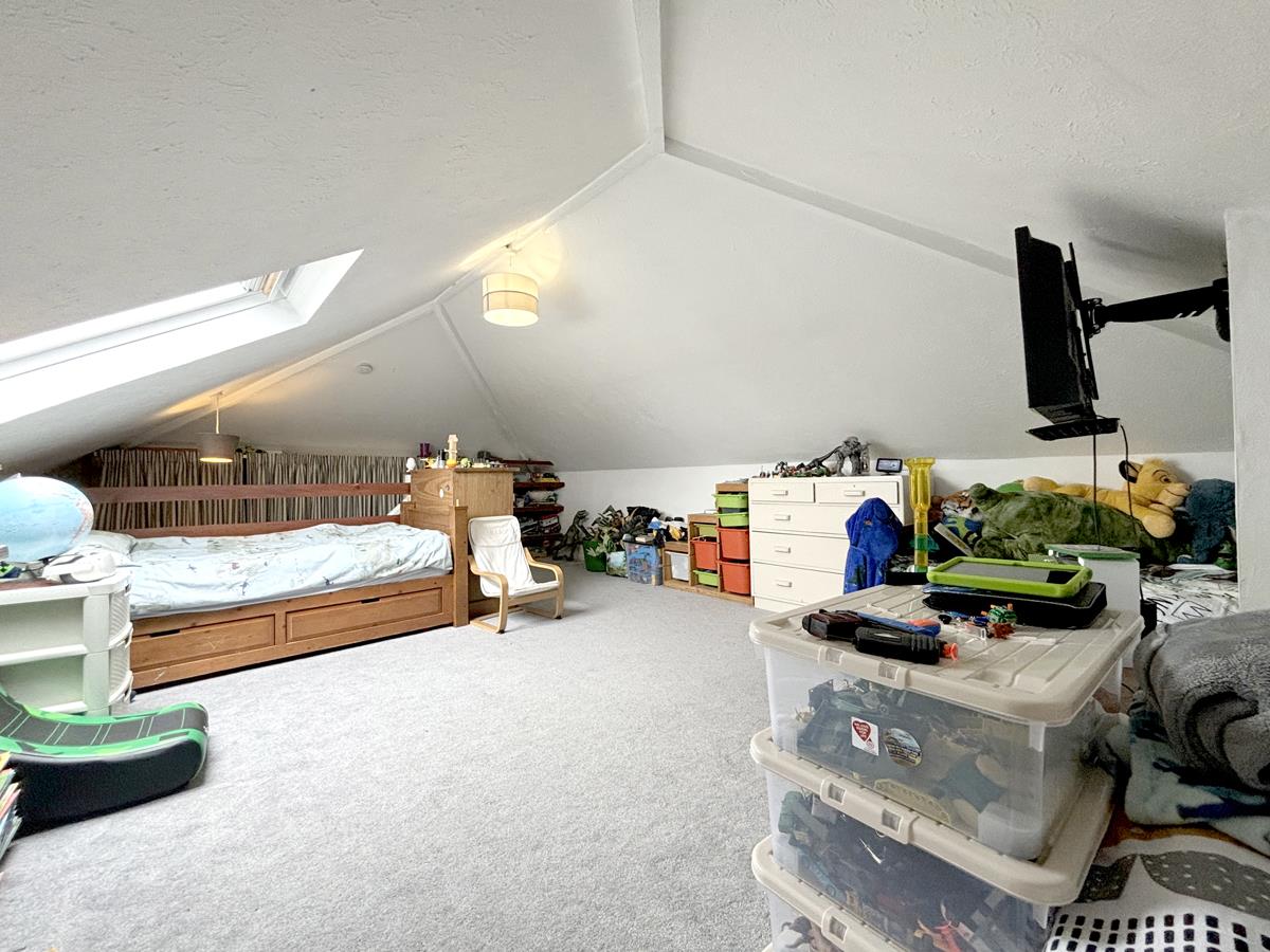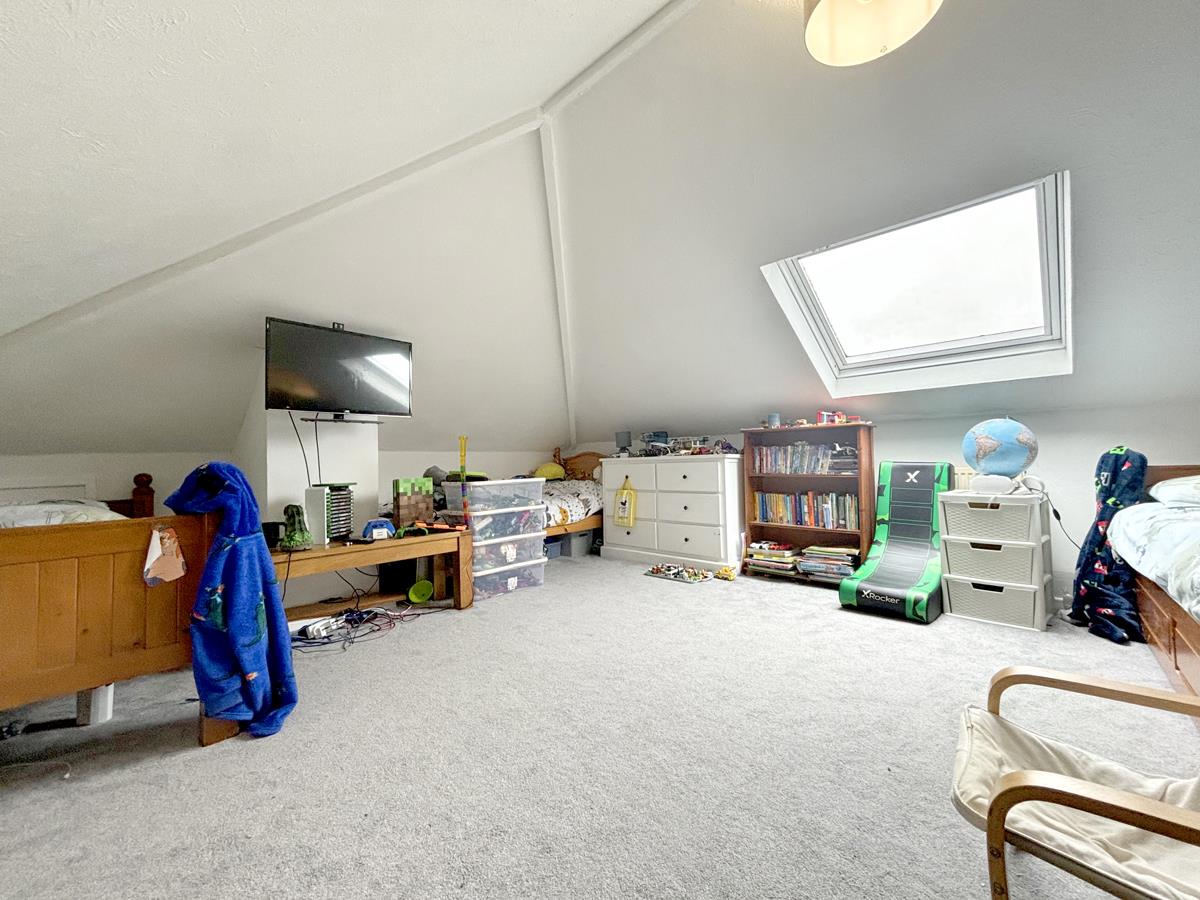 with limited head height in places. Currently arranged as a triple bedroom this is a fabulous versatile room which would also be suitable for a second lounge or office. Velux style window to the rear offering views across surrounding properties to the coast and countryside beyond. Radiator and eaves storage.