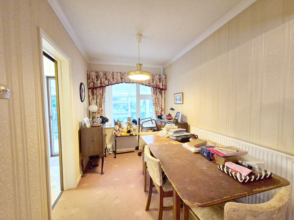 Steps down into this room which has a pleasant outlook over the rear garden and doors to the outside.