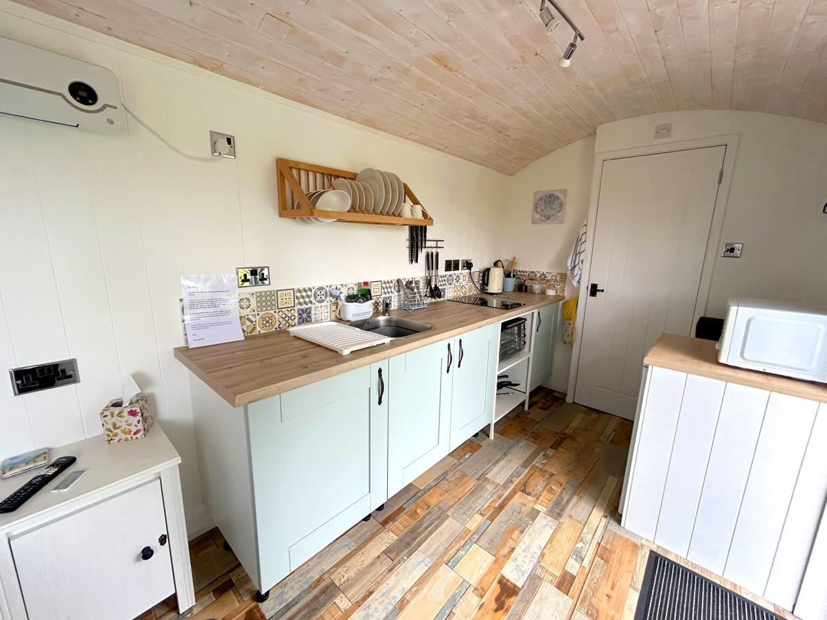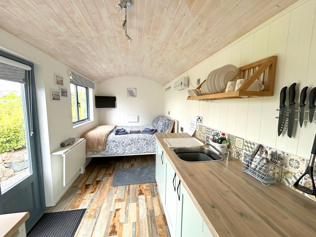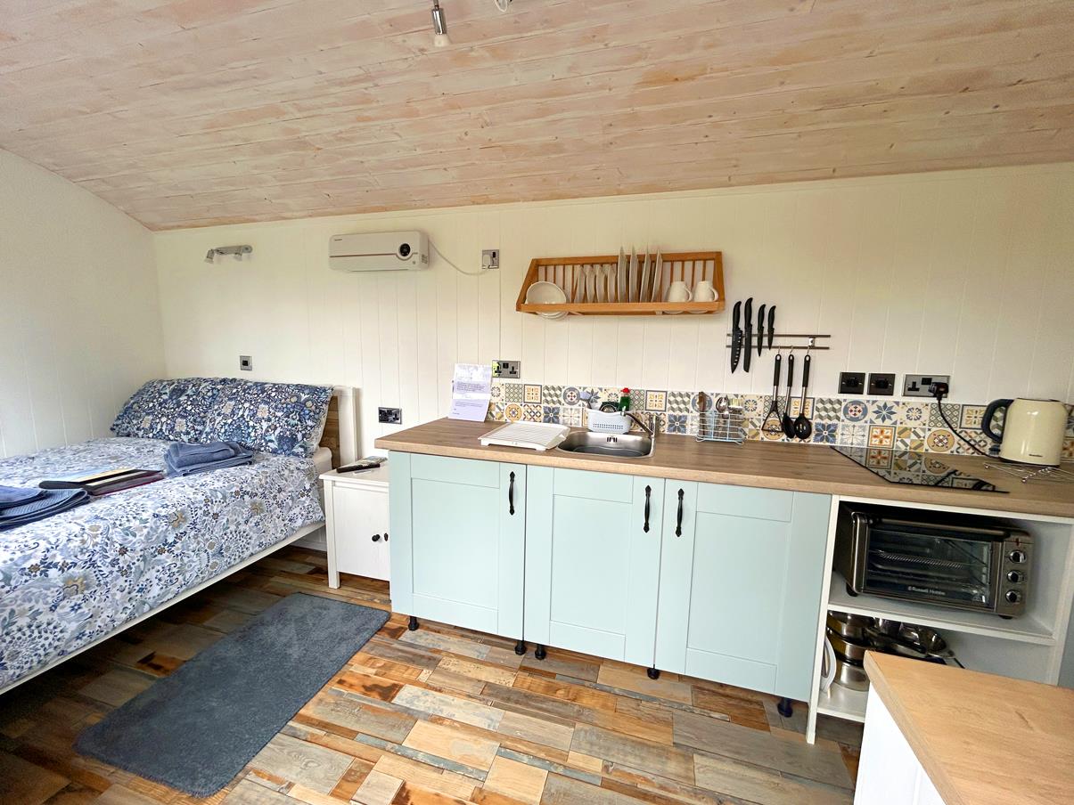 Comprising an open plan living space accessed by double doors and window to the front. There is a double bed with wall mounted television, a drop down table and beautifully stylish kitchen area featuring pale blue base units with rolltop work surfaces over. Sink with mixer tap, undercounter fridge and two zone ceramic hob and express air frying mini oven/grill. Wall mounted heater.