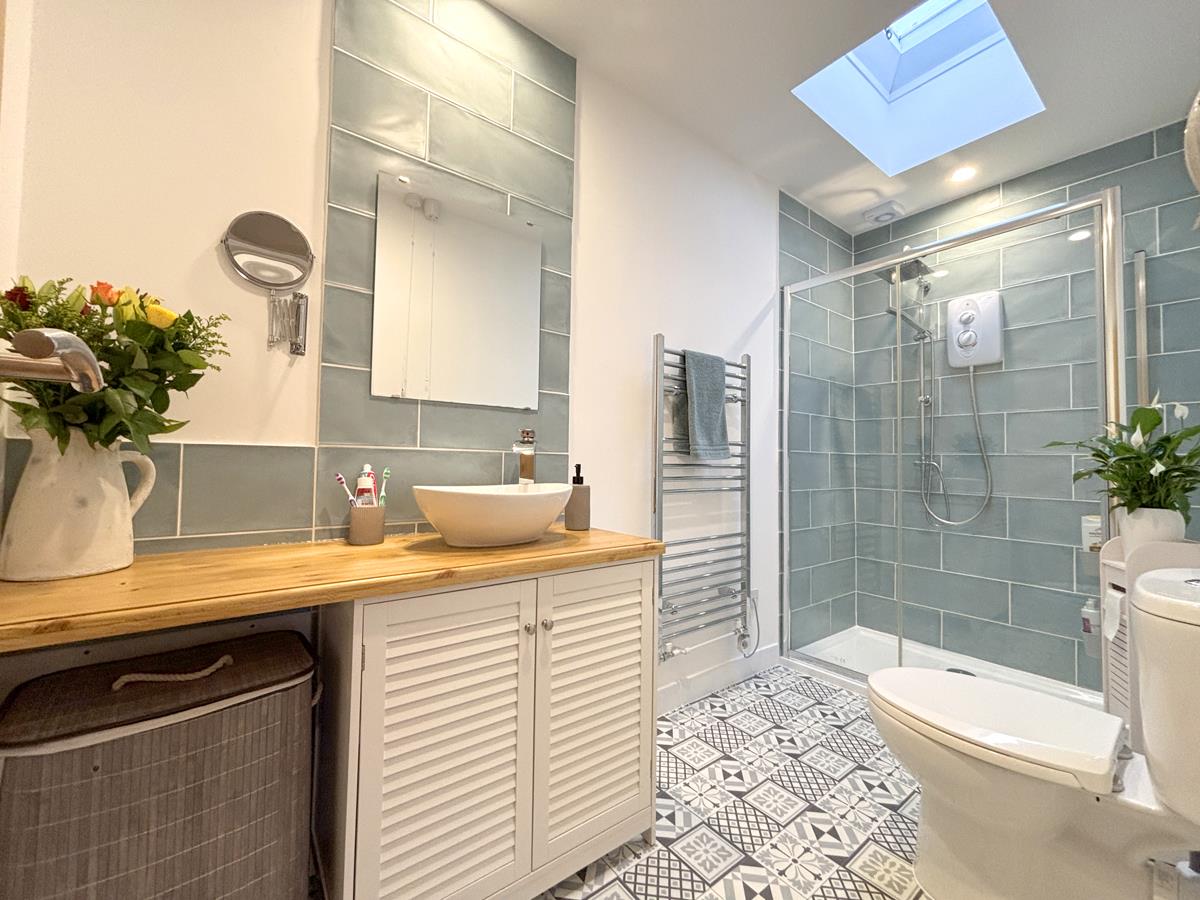 A stylish shower room with attractive tiles. Featuring a large cubicle housing a Mira Sport electric shower with drench head and hand held wand, stylish wash hand basin and low level W.C., chrome effect ladder style heated towel rail, underfloor heating and opening atrium style roof light.