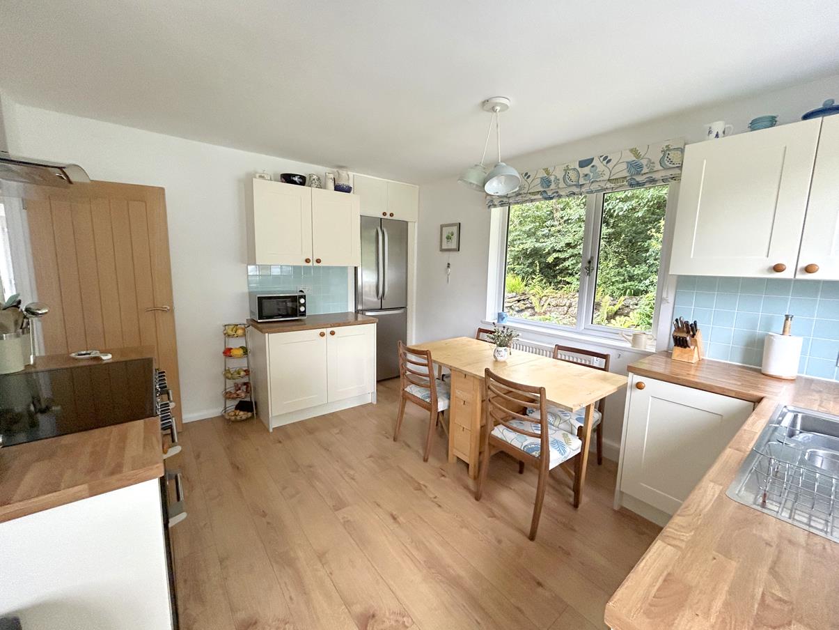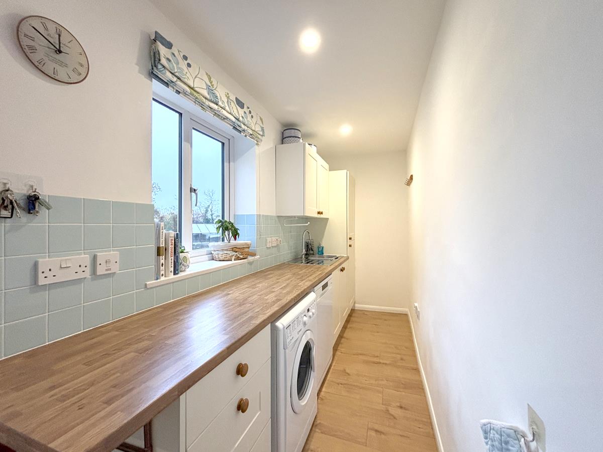 A lovely dual aspect room with windows to side and rear overlooking the garden and door accessing the rear garden. Fitted with a shaker style kitchen with butcher's block effect work surfaces over with one and a half bowl stainless steel sink, drainer and mixer tap, space and point for fridge/freezer, Cuisine Master Leisure range style oven with filter and light above, space for dining table. Open plan to utility area.