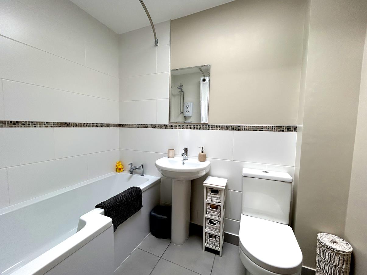With suite comprising a shower bath with Triton Riya electric shower over, stylish wash hand basin, low level W.C. and chrome effect ladder style heated towel rail. Opening atrium style roof light and underfloor heating.
