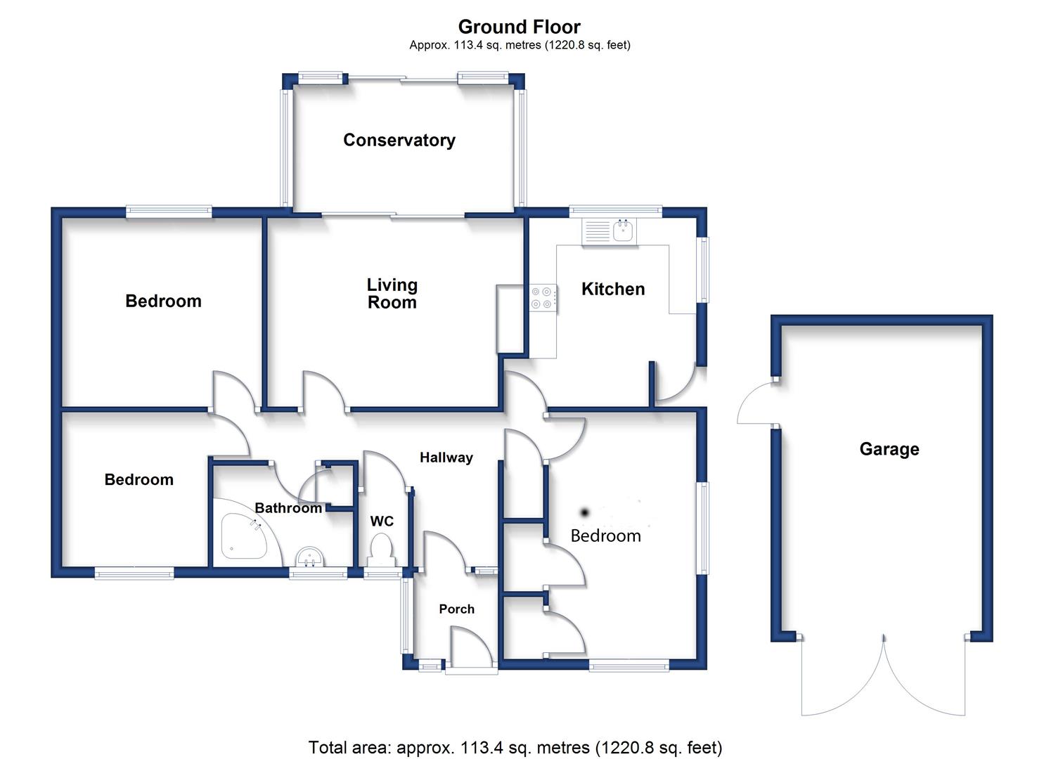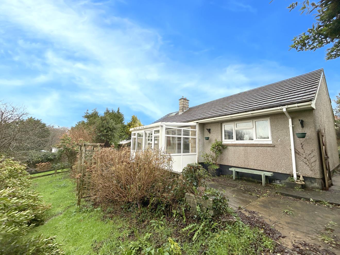 The accommodation in brief comprises an entrance porch, hallway, kitchen, lounge, conservatory, bathroom and three bedrooms. There are gardens to both front and rear, a driveway with parking for a number of vehicles and a garage.
