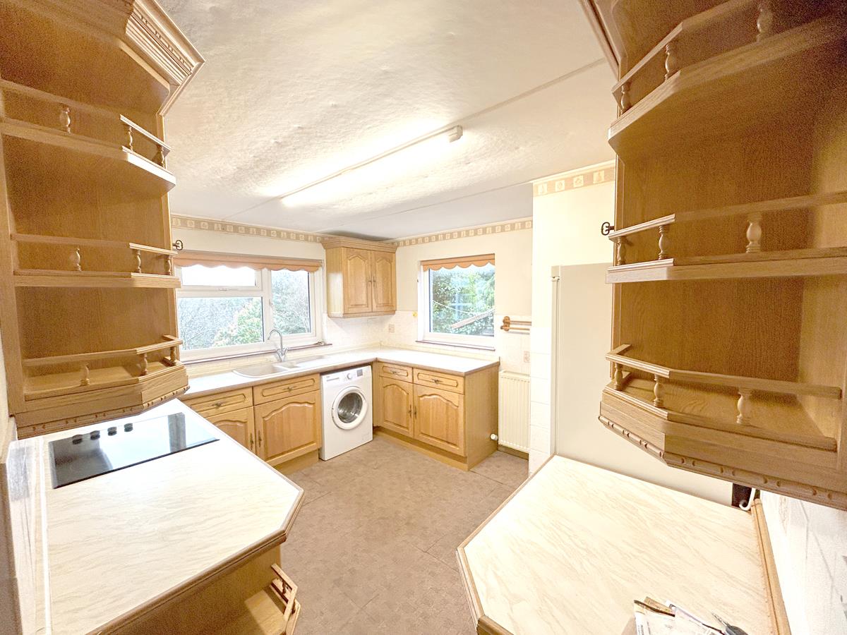 Comprising a fitted pine kitchen with working top surfaces incorporating a one and a half bowl composite sink with drainer and mixer tap and an electric hob with hood over. There are a range of cupboards and drawers with matching eye level units, display shelving, partially tiled walls and an integrated electric oven. Spaces are provided for a freestanding fridge freezer and a washing machine. Dual aspect with a large window overlooking the rear garden and a window to the side aspect. Door to side.