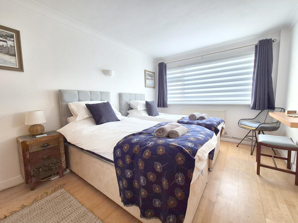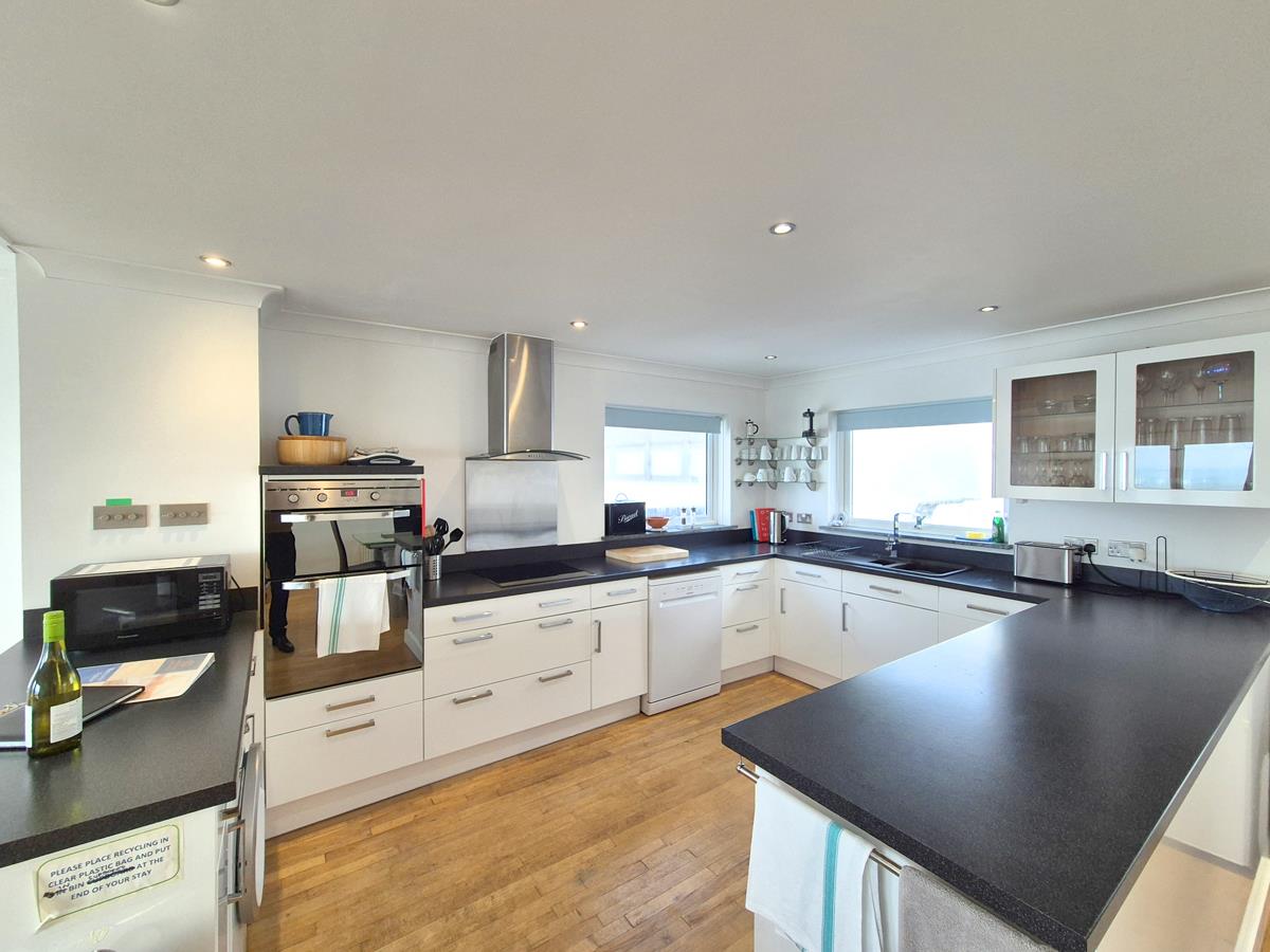 A fabulous open plan lounge, kitchen, diner which is triple aspect allowing one to take full advantage of the breathtaking sea and coastal views. Bifold doors open onto the balcony area which as previously mentioned would seem ideal for a morning coffee enjoying the marine vistas. French doors open onto the rear courtyard and a wood burner on an attractive hearth acts as a focal point for the room. There is access to the loft.