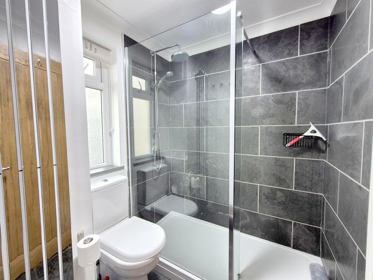 Comprising a close coupled W.C., walk-in shower cubicle with both rain and flexible shower heads, wash basin with waterfall style tap over and drawers under. There is a tiled floor, partially tiled walls, a heated towel rail and a frosted window to the side.