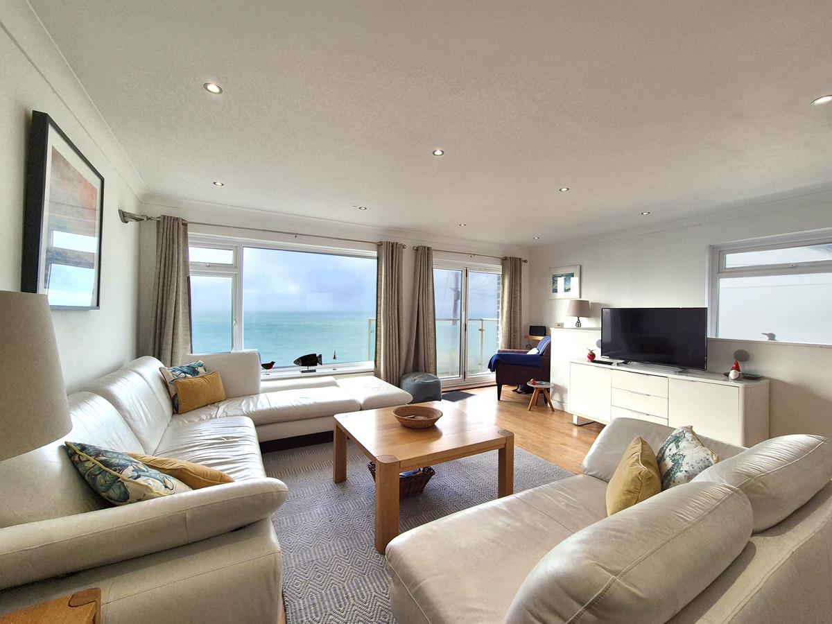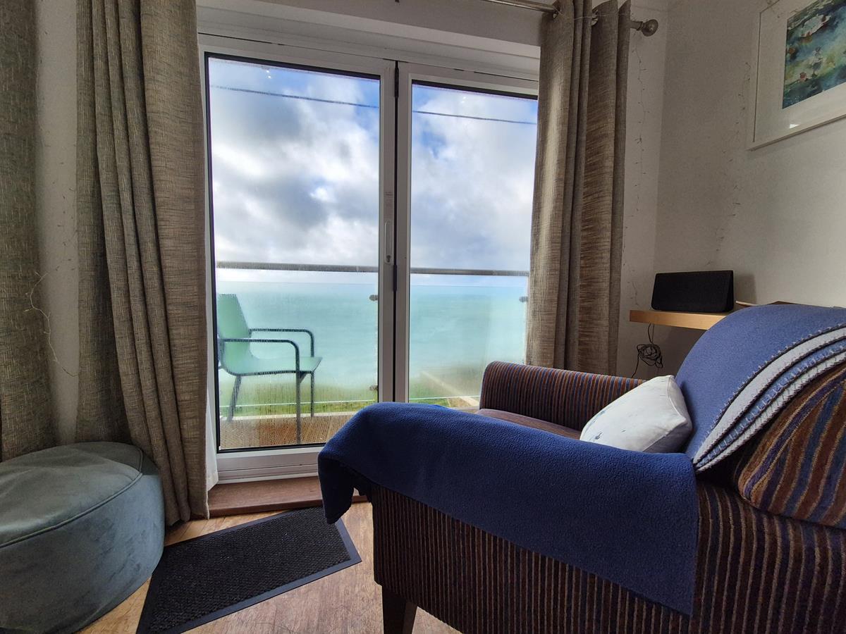 With outlook to the front and out to sea. There are stairs to the first floor, understairs cupboard, tiled floor, doors to all bedrooms and door to