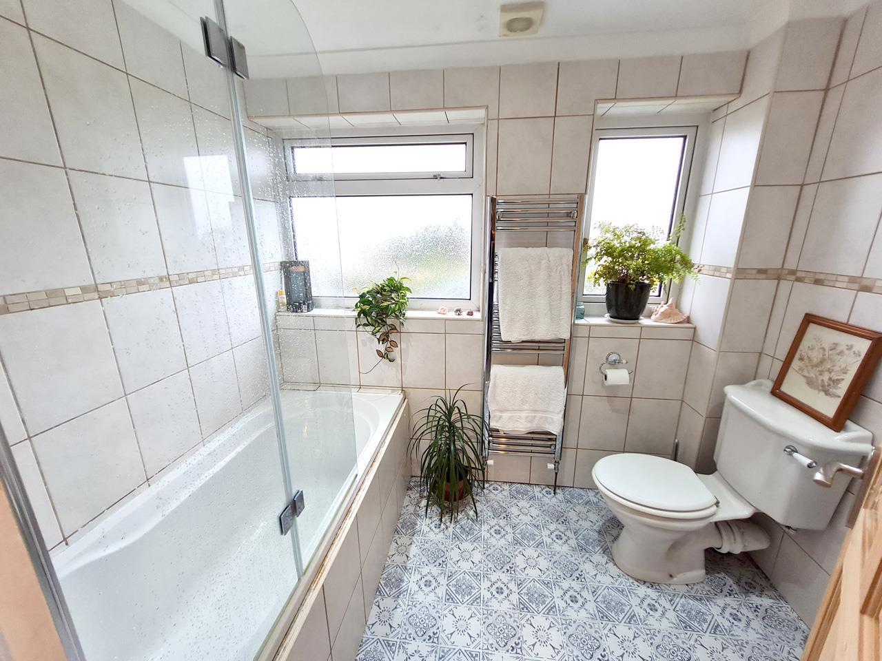 With a modern white suite comprising a bath with electric shower over, concertina glass shower screen, a low-level w.c and pedestal wash handbasin with a mirrored medicine cabinet over. There is tiling to the walls, patterned vinyl flooring, a chrome ladder style towel rail, recessed spotlighting, an extractor and twin obscure glazed windows to the rear.