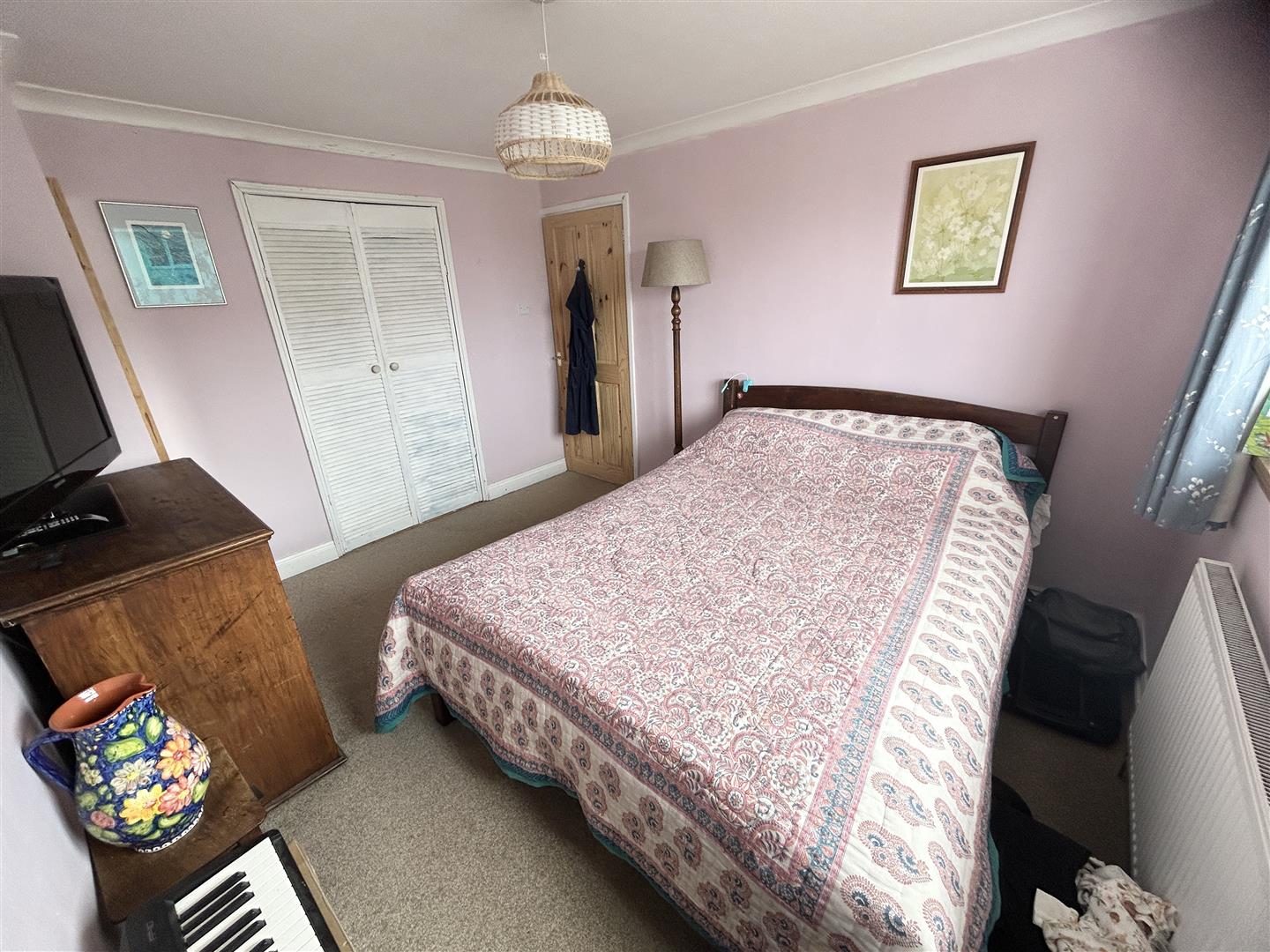 Double bedroom with a window to the front aspect, a built-in wardrobe with louvered doors, with a hanging rail and shelf above.