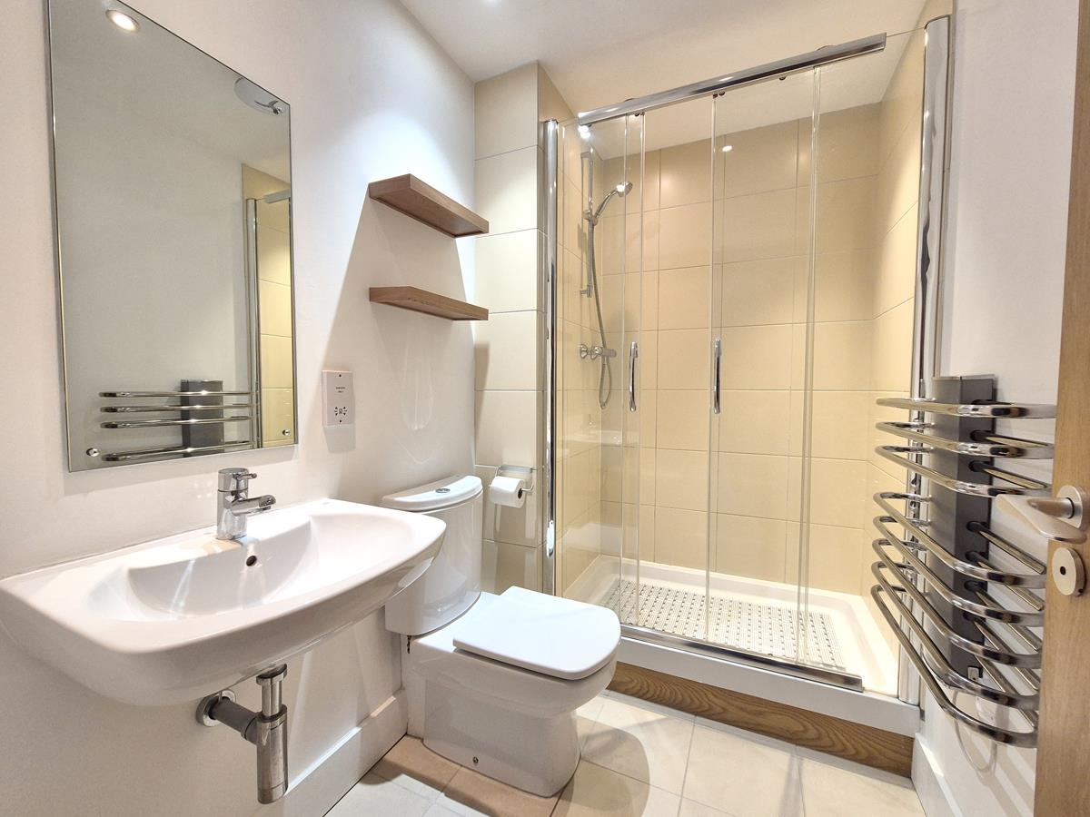 Comprising shower cubicle, close coupled W.C. and a wall mounted wash basin with mixer tap over. There is a tiled floor, partially tiled walls and a heated towel rail.
