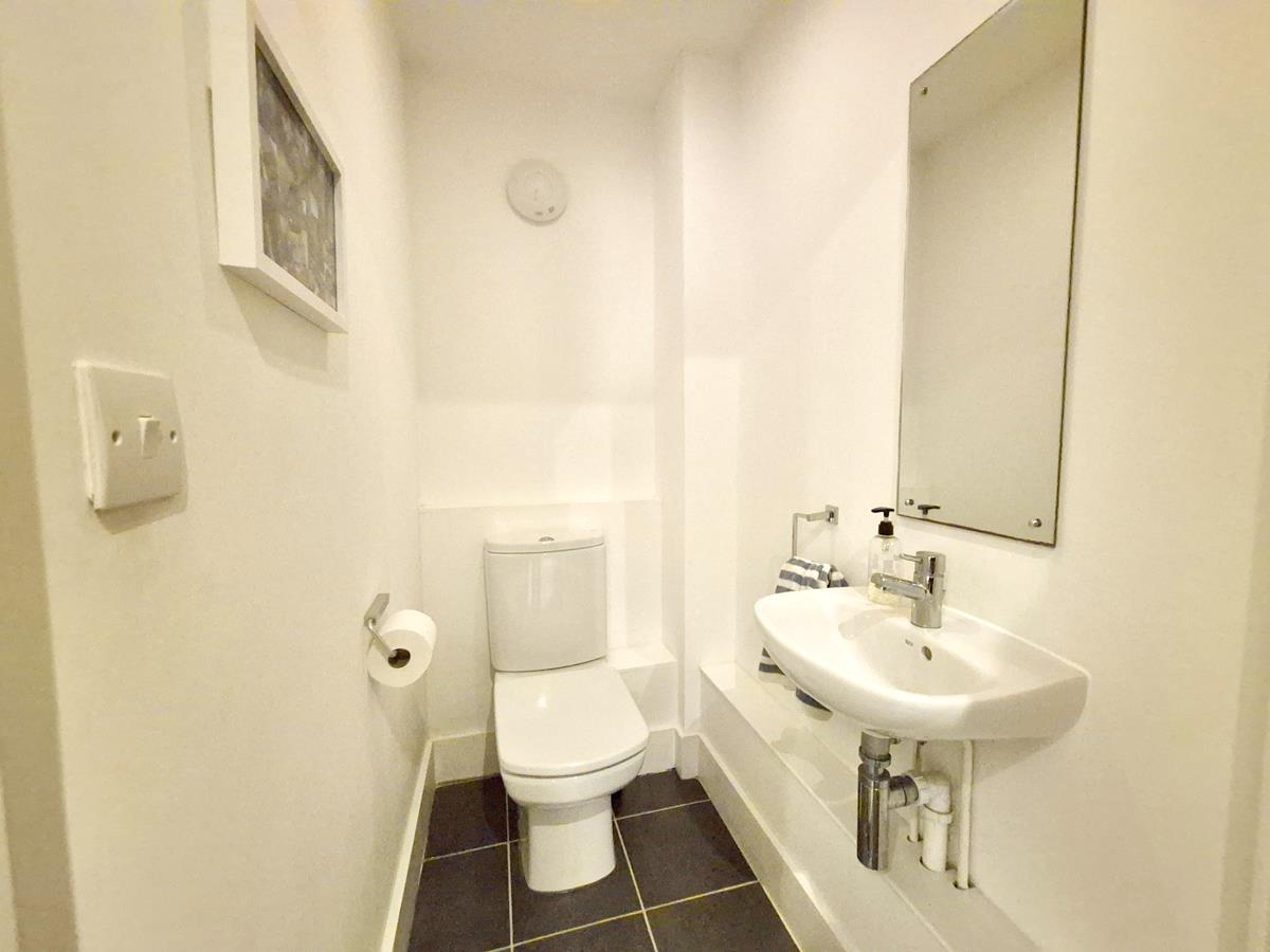 Having a W.C. with wall mounted wash basin with mixer tap over. There is a tiled floor.