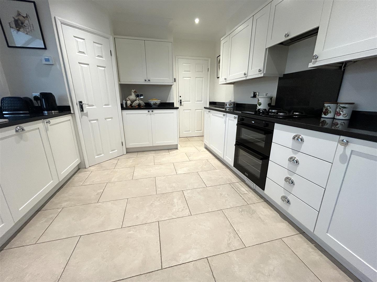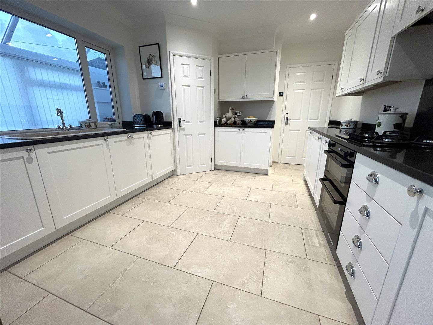 A wonderful, light-filled family space featuring a stylish white Shaker-style kitchen with chrome handles and luxurious black granite worktops. The kitchen is beautifully appointed, incorporating a Stoves four-burner hob with matching granite splashback, a sink and drainer with swan-neck mixer tap, and granite upstands. There is an excellent range of base cupboards, drawer units, and wall cabinets, together with a Stoves built-under oven, integrated fridge freezer, refrigerator, and dishwasher. A particularly useful large corner cupboard houses the Worcester gas boiler, offers plumbing for a washing machine, and provides additional shelving for storage.