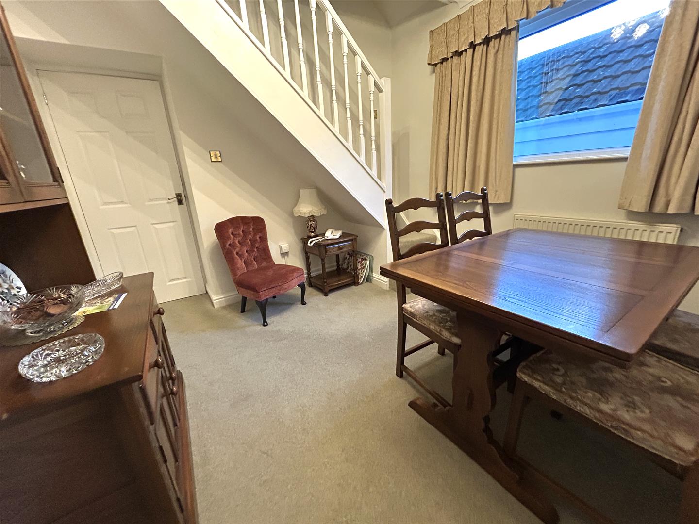 From the dining room a turning staircase leads to the first floor landing with a door to