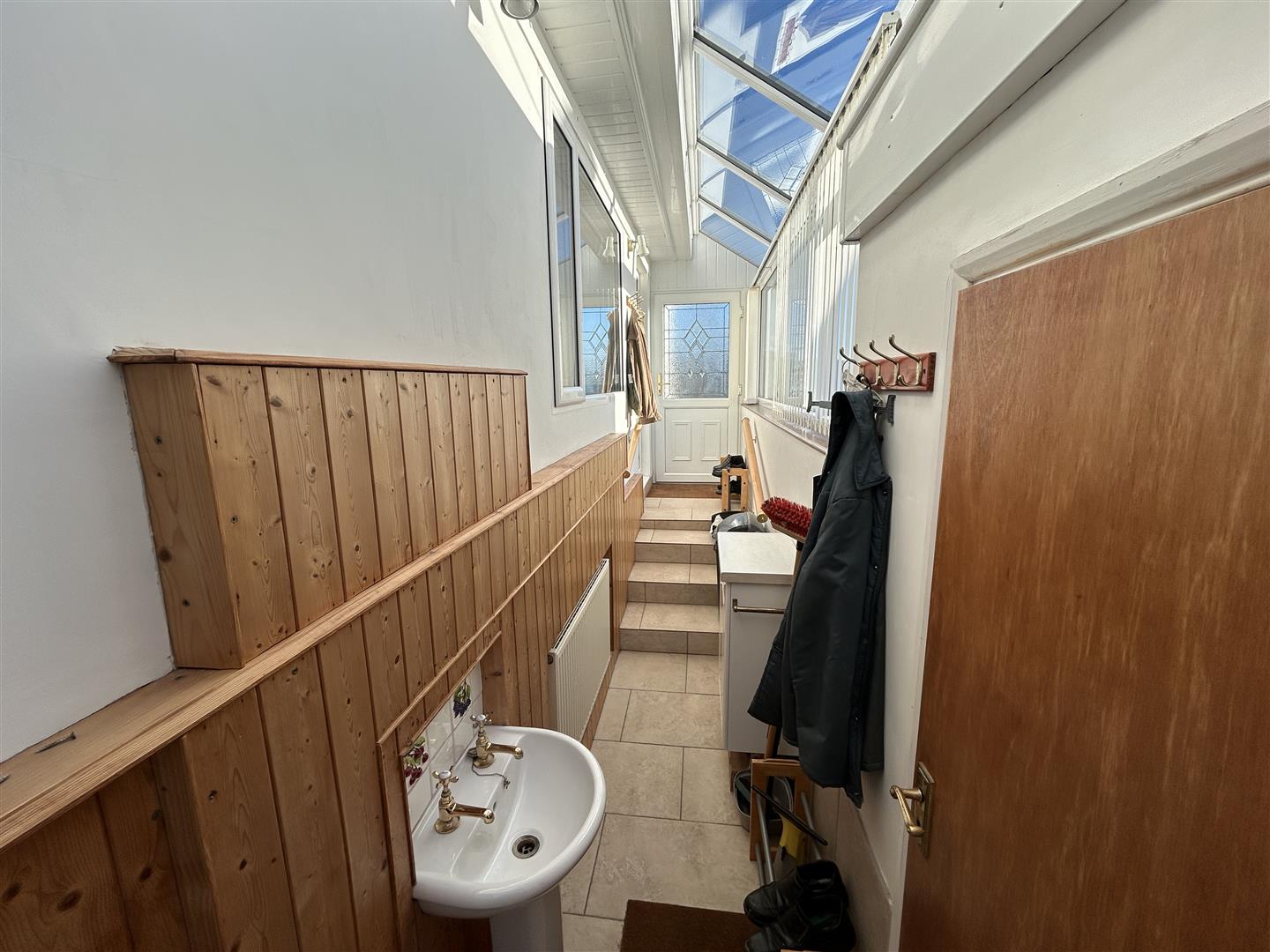 From the kitchen a part glazed door leads out to the rear entrance and porch area with feature leaded glazed window to the side aspect, large window with roof lights to the side aspect. Tiling to the steps and floor which leads down to an area which houses a sink unit with tiled splashback and service door back to-