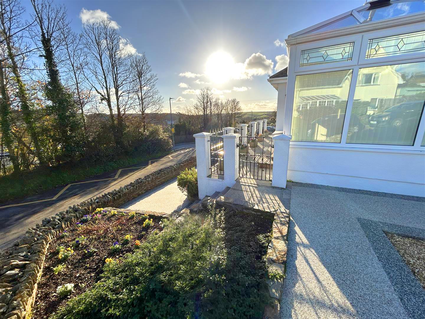 The room enjoys windows to the side and rear, offering a lovely elevated outlook across the rooftops of Helston and stretching towards open countryside. Attractive floor tiling runs throughout and is complemented by thermostatically controlled underfloor heating, ensuring comfort year-round.