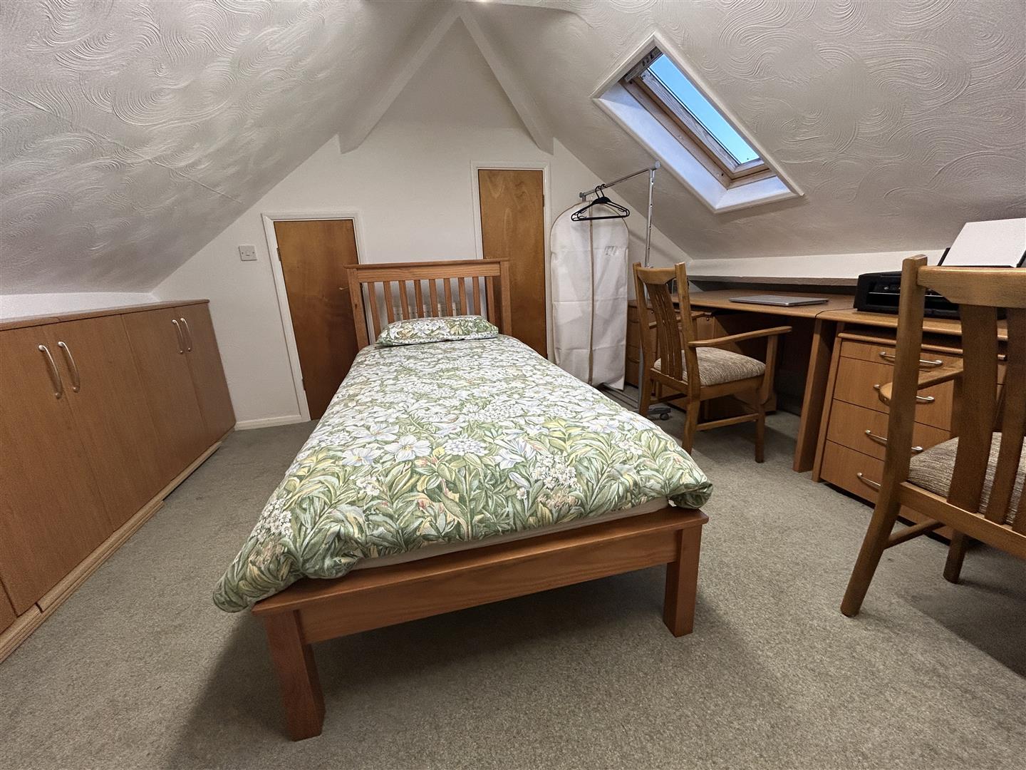 With limited headroom at its eaves, four eaves storage cupboard areas along one wall, there is built-in storage.