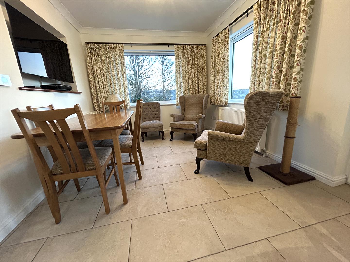 At the dining end of the room, there is a recessed area—currently used to mount a TV—and a remote-control air-conditioning unit for added comfort. Doors lead through to the conservatory, as well as to the rear porch and rear hallway. The space is well lit by a combination of recessed downlighters and an attractive pendant light.