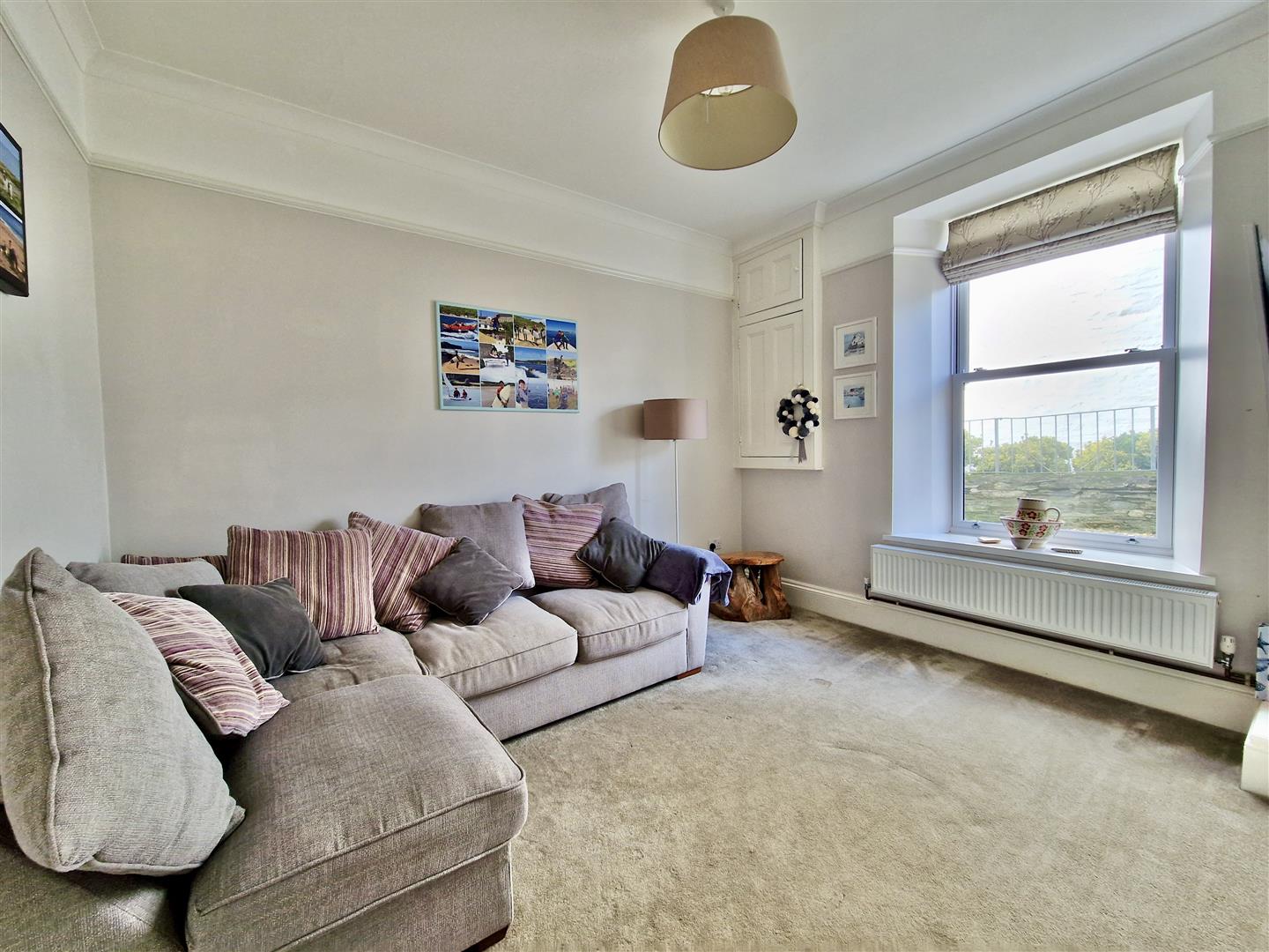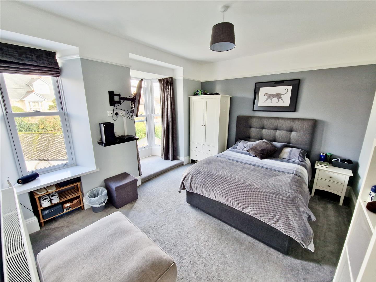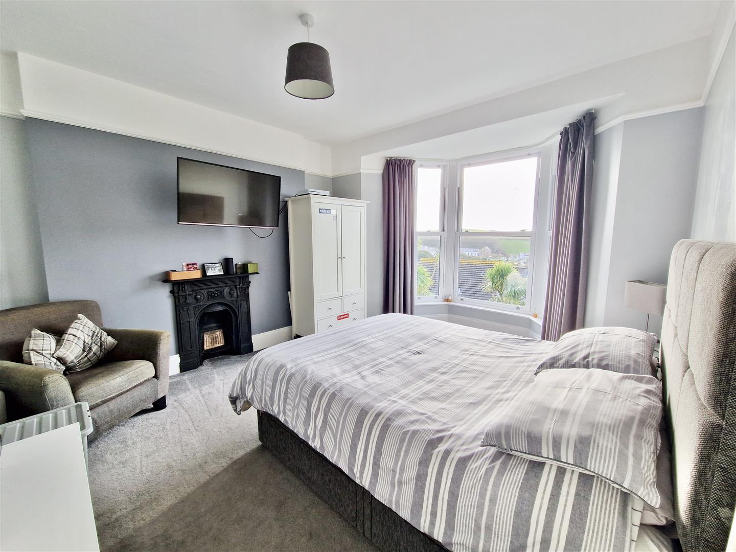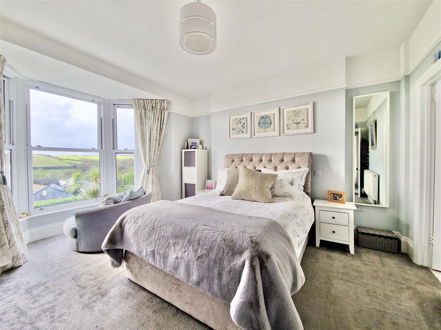 With outlook over the village, open countryside, out to sea, Bickford Smith Institute clock tower and pier. There are an array of Sharps built in wardrobes and a door to