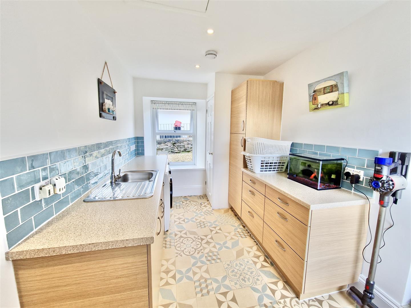 A dual aspect room comprising working top surfaces incorporating a sink unit with drainer and mixer tap over, cupboards and drawers under. There is space for a washing machine, tumble dryer and a built in cupboard houses a water tank with immersion heater. The room has spotlighting and access to the loft space. Door to the outside and door to