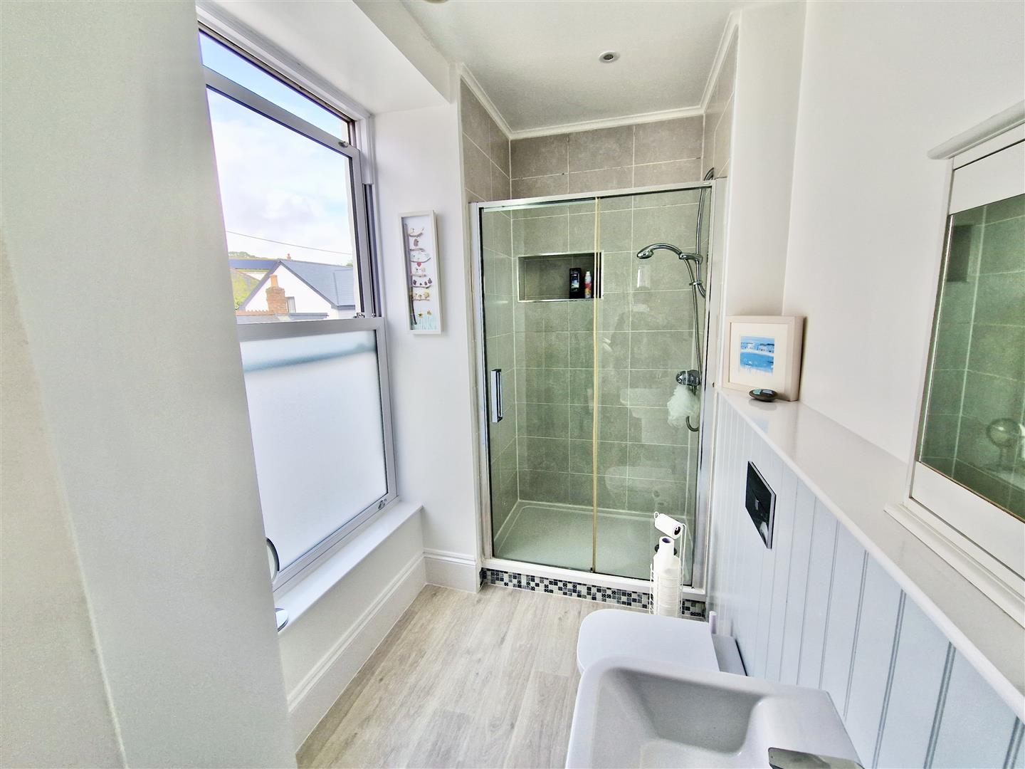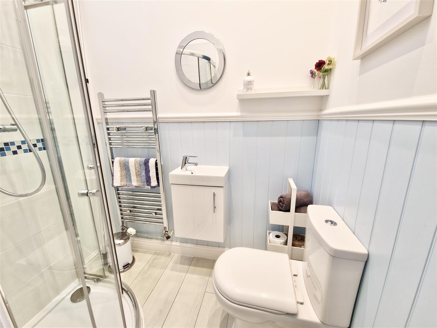 Comprising a shower cubicle, wall mounted wash basin with mixer tap over and a close coupled w.c. with a concealed cistern. There is a window to the side, LED spotlighting and a heated towel rail.