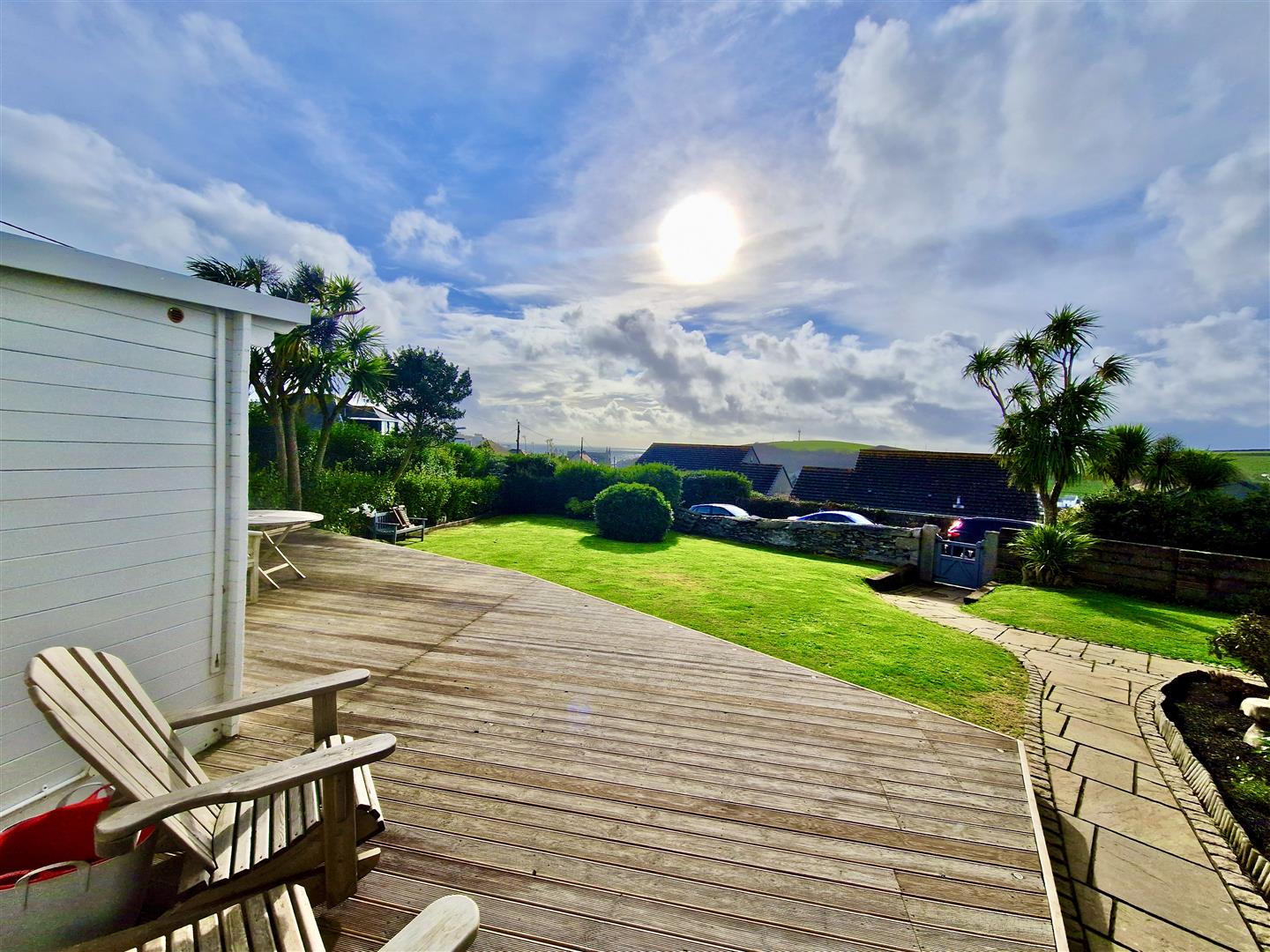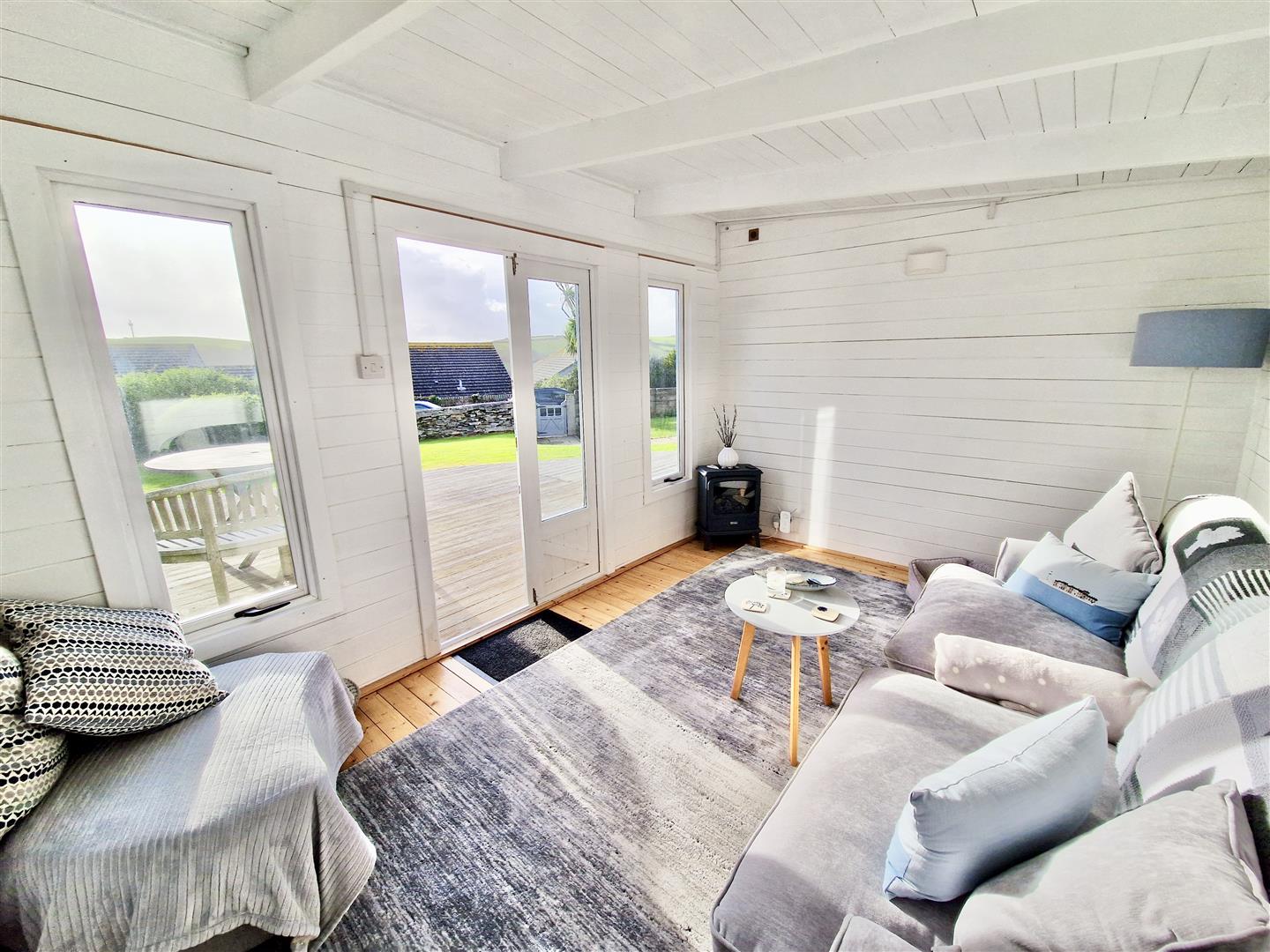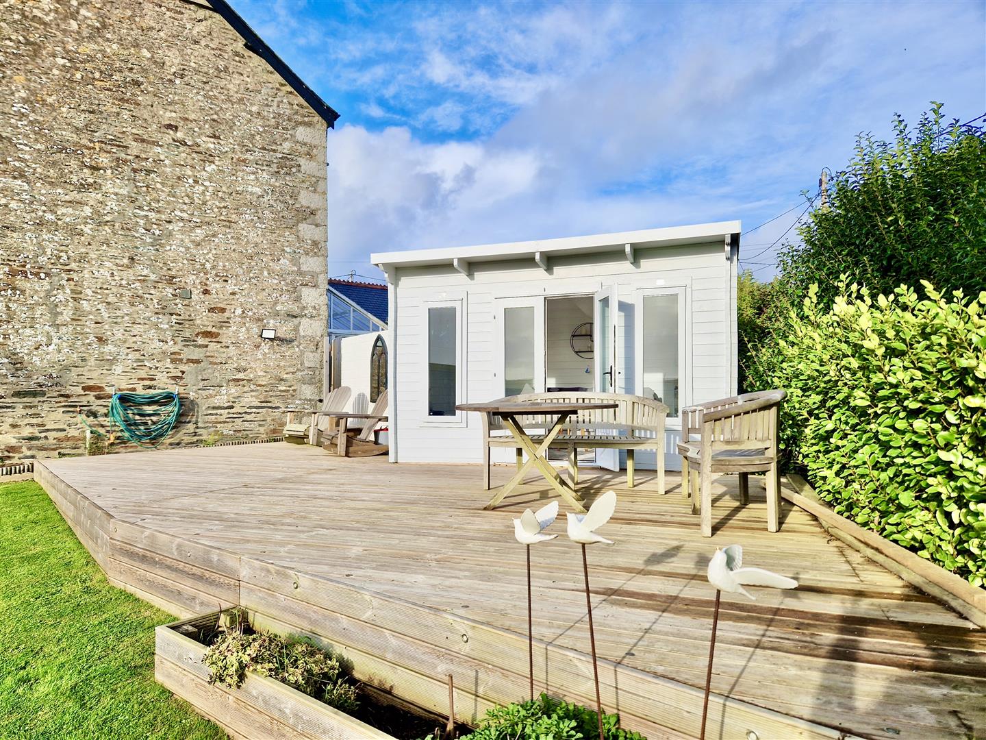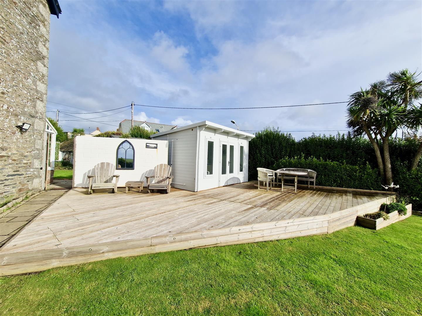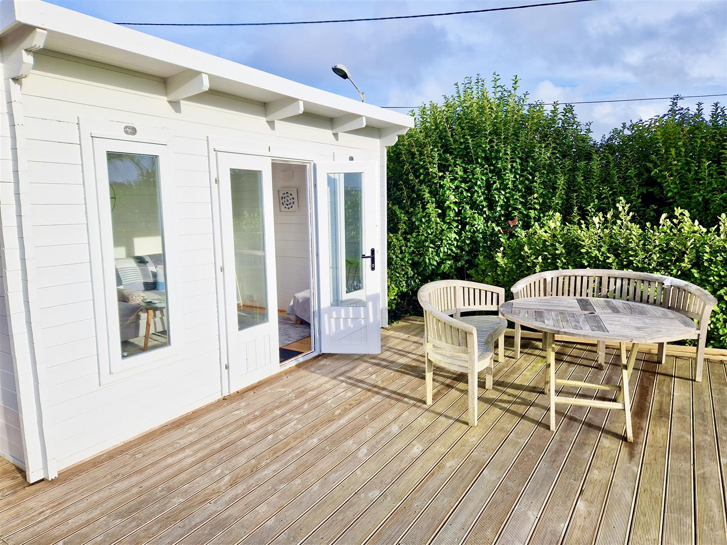 A charming summer house with French doors opening onto a generous size decked area which would seem ideal for al fresco dining and entertaining.