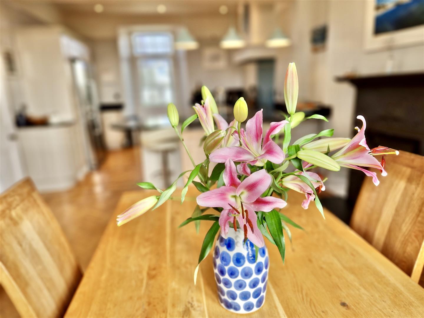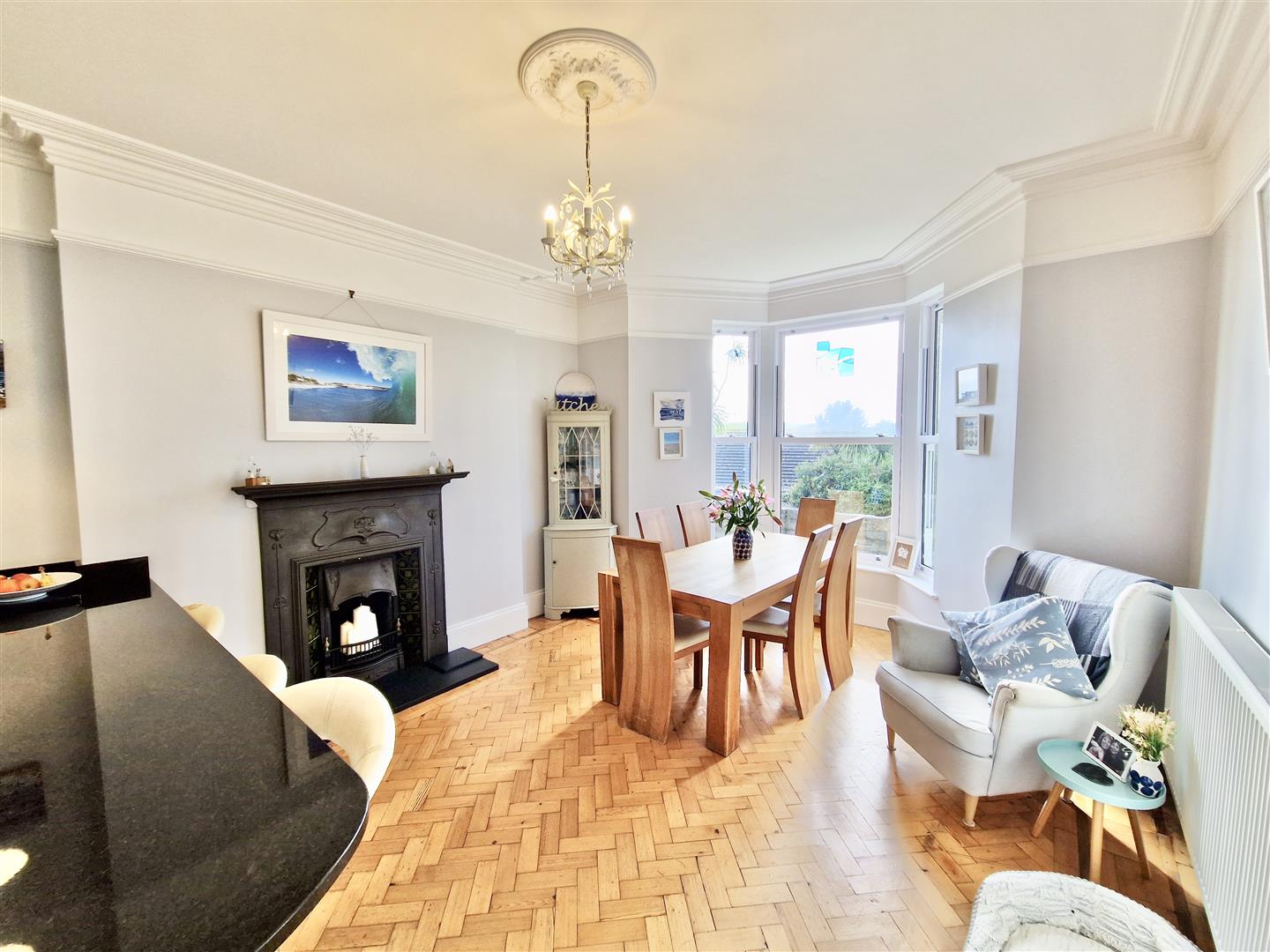 The dining area is equally impressive, featuring a charming fireplace with hearth, surround and mantel (open fire not currently in working order) which forms an elegant focal point to the room. A large bay window enjoys delightful views over the garden and village, stretching across open countryside and out to sea. Door to…