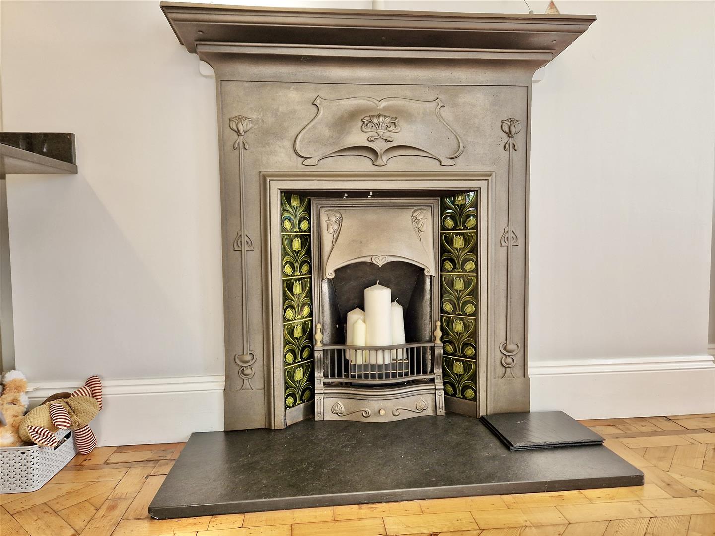 With outlook over the front garden, village, towards open countryside and out to sea. A feature fireplace acts as a focal point for the room and houses a wood burner with hearth, surround and mantel over. The room has Parquet flooring.