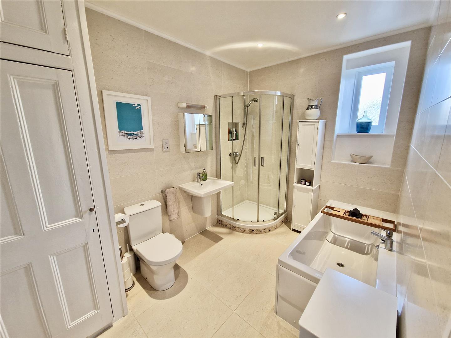 A well-appointed suite comprising a panelled bath with mixer tap, separate shower cubicle, wall-mounted wash basin with mixer tap, and close-coupled WC. Additional features include a heated towel rail, tiled flooring, LED spotlighting and an obscure-glazed window to the rear. There is also a built-in airing cupboard providing useful storage.