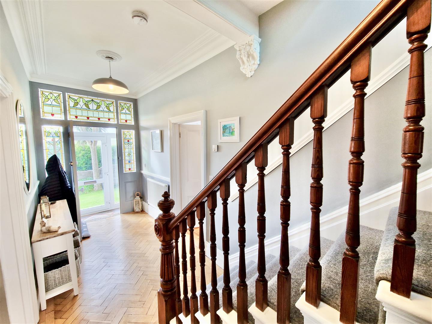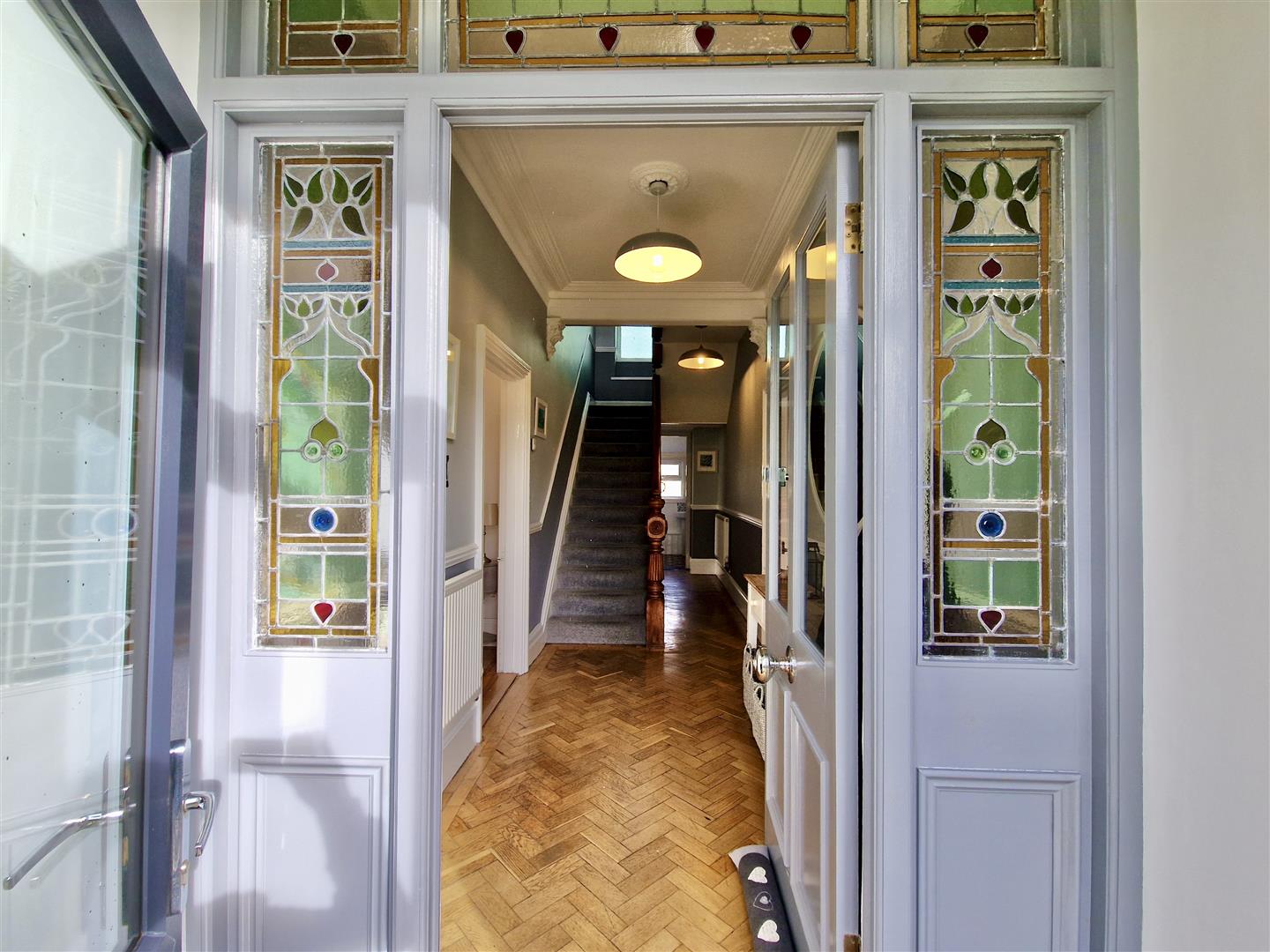 Stairs with beautifully crafted wood balustrade ascend to the half landing with stained glass window and then on further to the first floor landing. There are doors to all bedrooms and door to