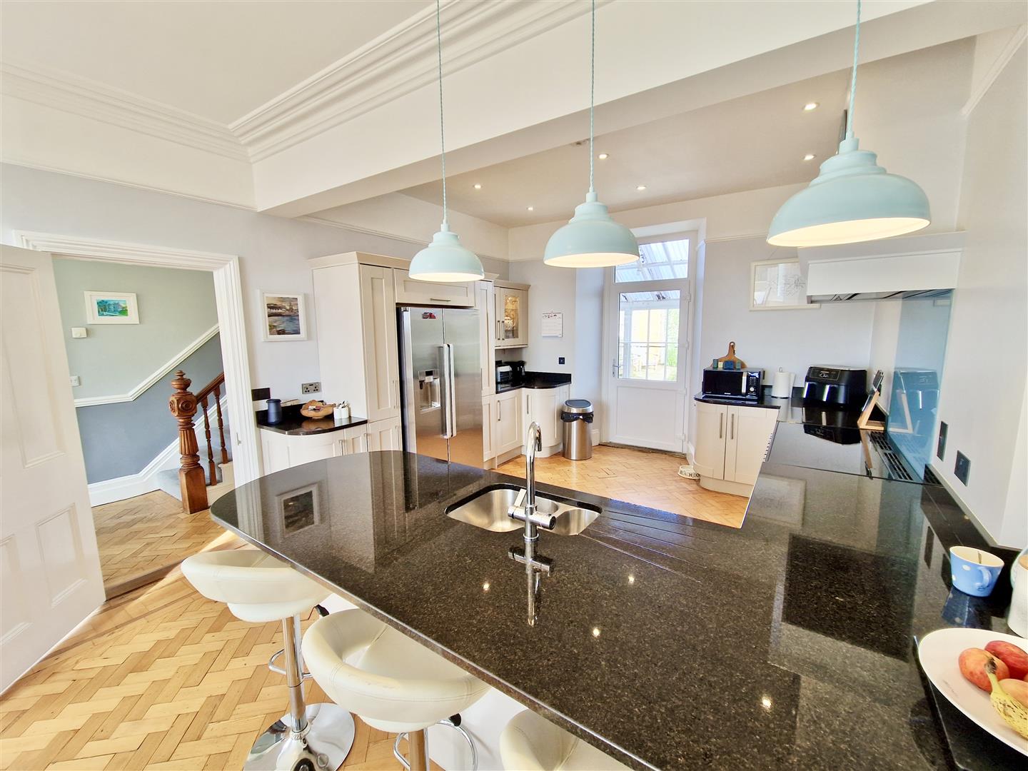 A superb and spacious open-plan kitchen/dining room, perfect for modern family living and entertaining. The kitchen area is fitted with a stylish and contemporary range of units complemented by attractive granite work surfaces incorporating an inset one-and-a-half bowl sink with mixer tap, with cupboards and drawers below. There is a built-in dishwasher, space for a Rangemaster-style cooker, and an American-style fridge/freezer. The room is beautifully finished with parquet flooring, and LED spotlighting provides a warm and inviting atmosphere. A door leads from the kitchen area to the potting room.