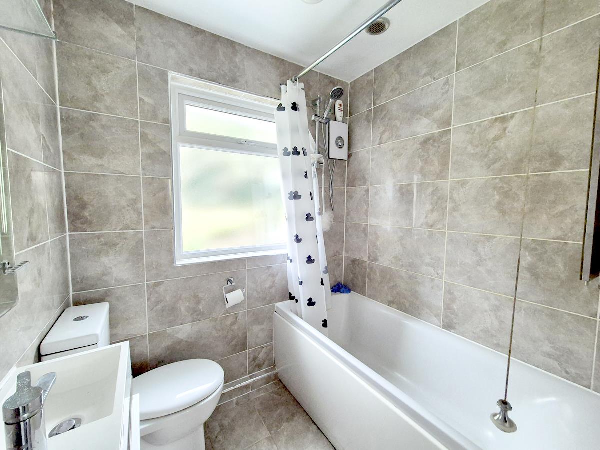 With tiled floor and walls, suite comprising of a bath with electric shower over, low level w.c. and wall mounted wash hand basin in a vanity unit. The room has a frosted window to the rear.