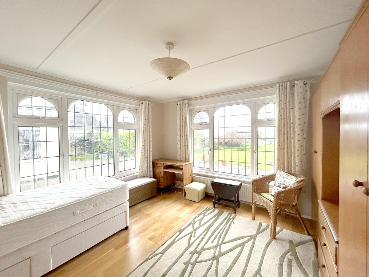 A super dual aspect bedroom with extensive glazing and views over miles of rolling countryside and onwards to the sea in the distance and the room has smart wood effect flooring.