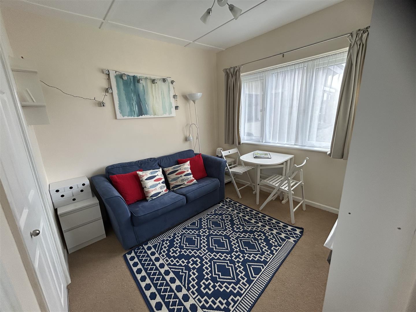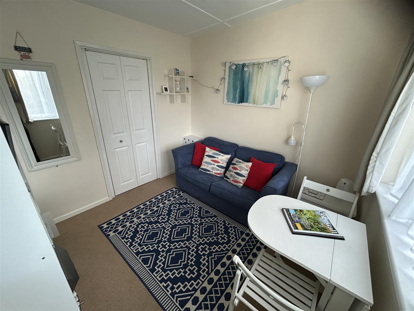 Enjoying a sunny aspect with mounted shelving, tv point, window overlooking the communal grounds and parking area to the front. There is an opening to the kitchen and a folding door to