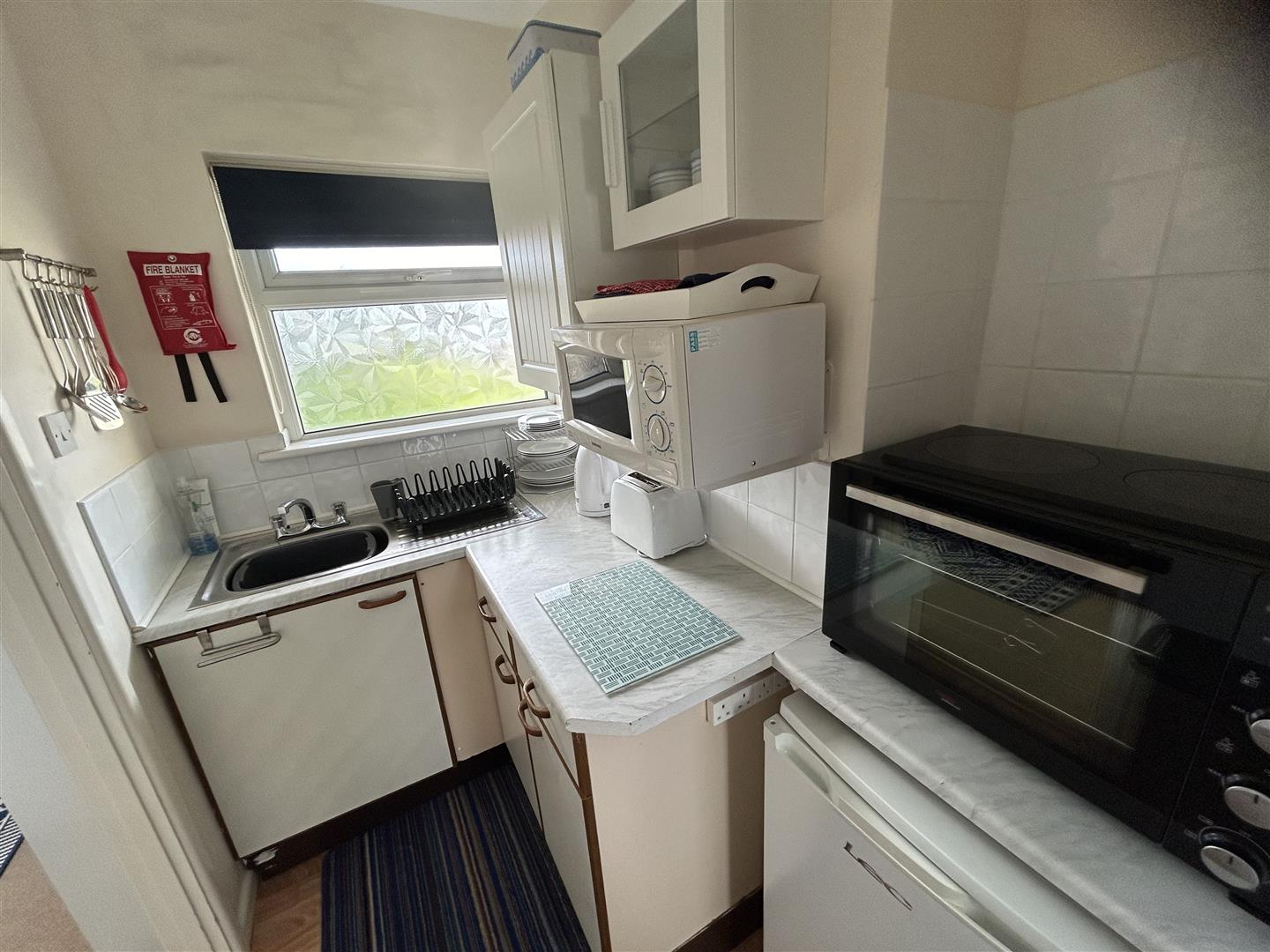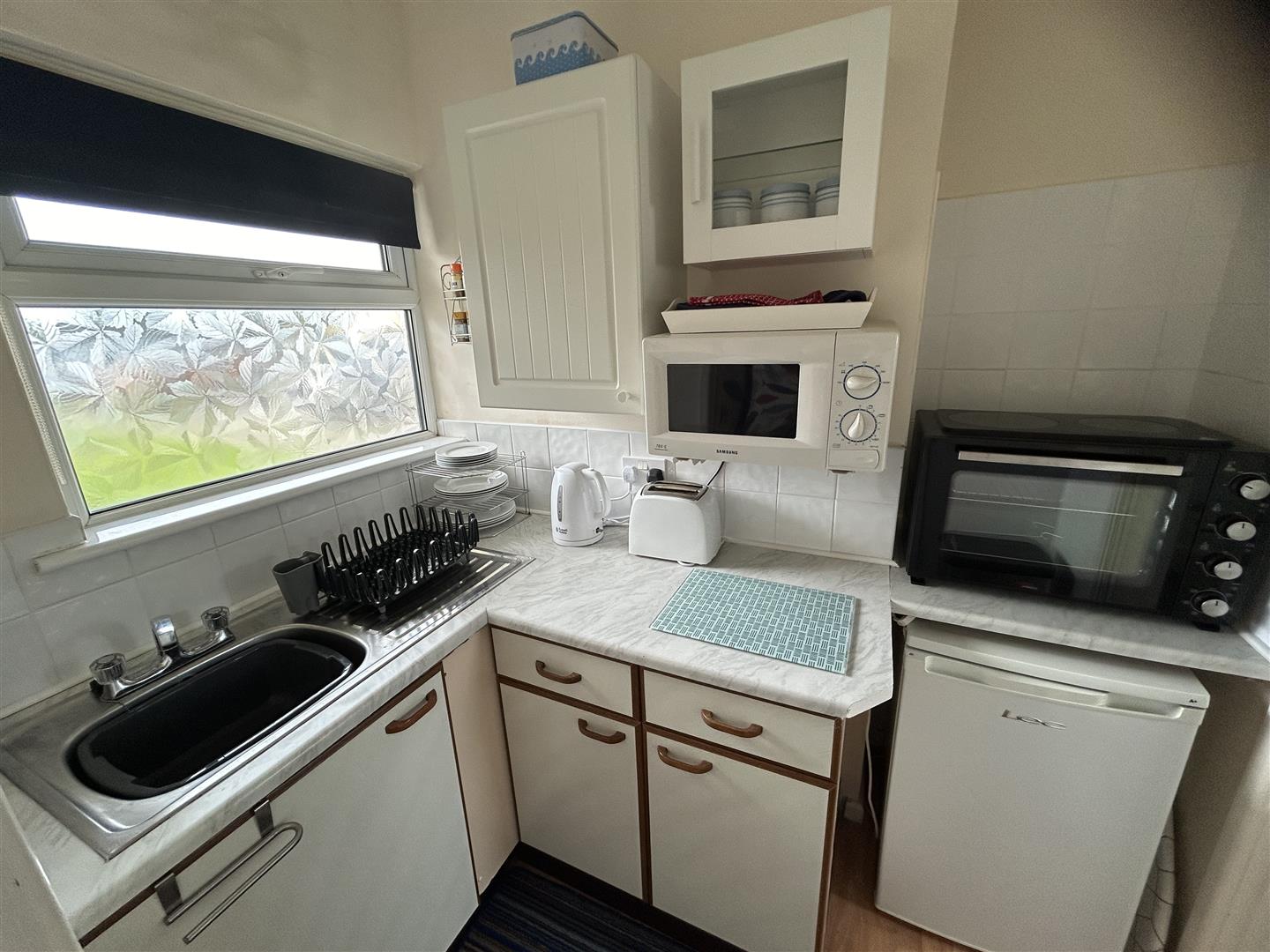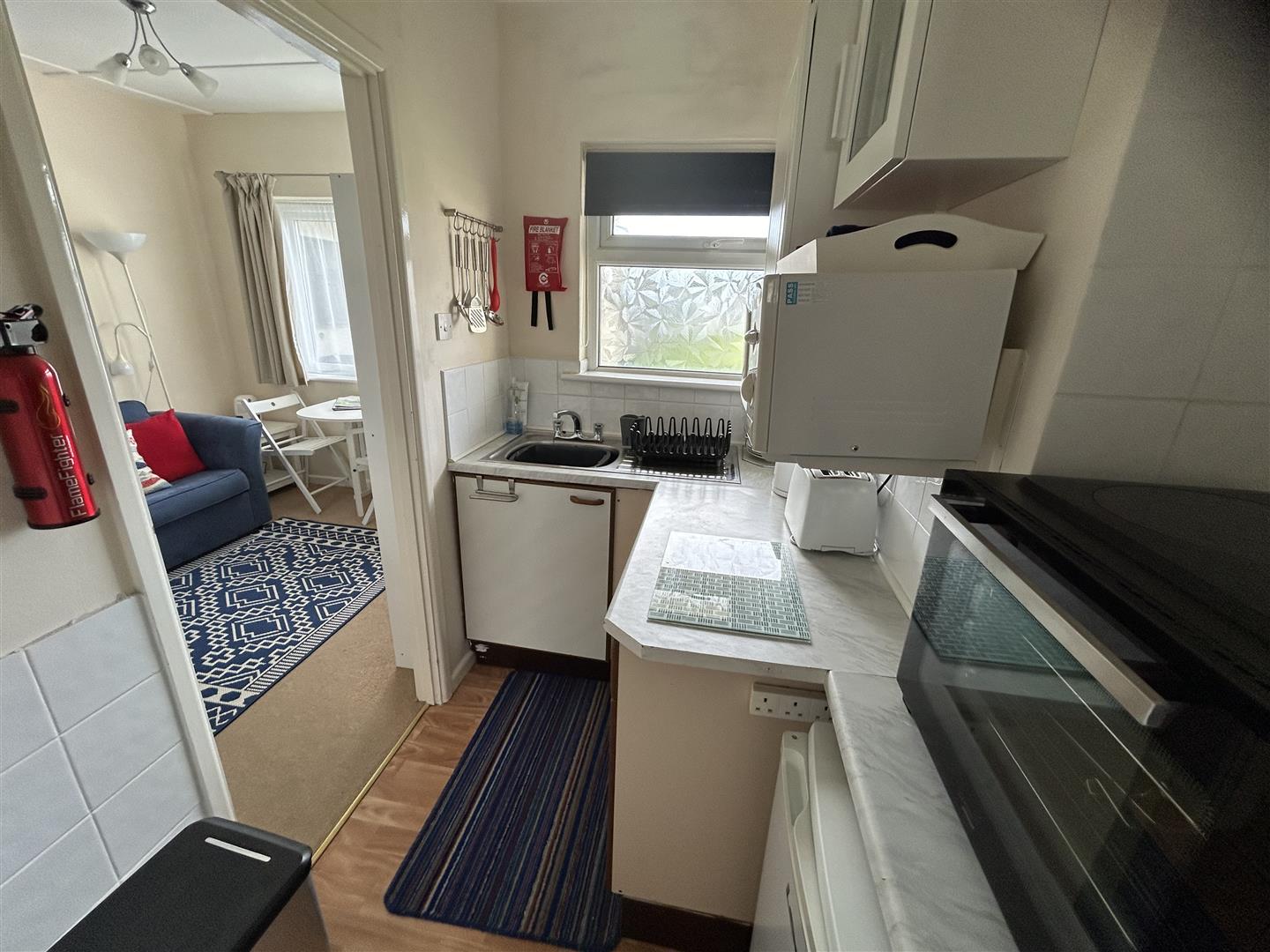 Comprising a fitted kitchen with working top surfaces incorporating a sink with drainer and mixer tap over with white tiled splashbacks (with attractive seashell feature tiles). There are a range of base units with drawers and cupboards under (one containing the water heater), space for a fridge/freezer, shelf suitable for a microwave and wall units with cupboards (one with display shelf). There is wood effect vinyl flooring, a corner unit with shelving, a spotlighting arrangement, part tiling to the walls, an obscure glazed window to the front aspect and a concertina door to