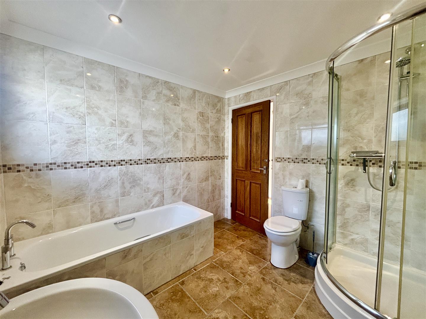To the rear are two generous double bedrooms, both benefiting from built in storage. The third bedroom has been thoughtfully converted from the former garage and provides a highly versatile space, perfect as a guest bedroom, hobby room or an ideal home office for those working remotely. The bathroom is spacious and well appointed, offering both a bath and a separate shower cubicle. Further storage is provided by a linen cupboard and a separate cloaks cupboard, adding to the home’s practicality.