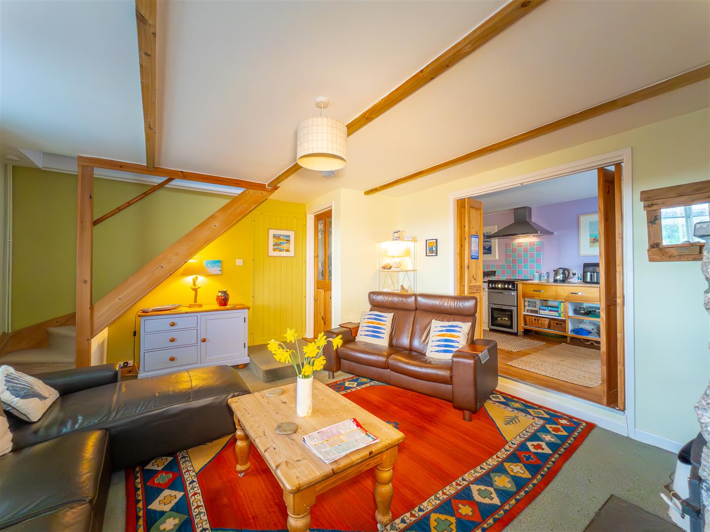 A lovely cosy room with two windows to front, radiator, log burner set in stone surround, stairs rising to the first floor, connecting door to the bedroom/dining room in the main property and concertina doors and door to