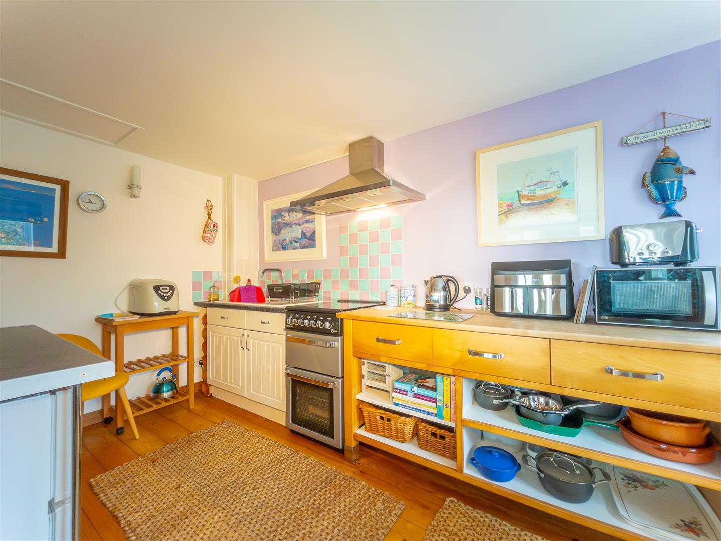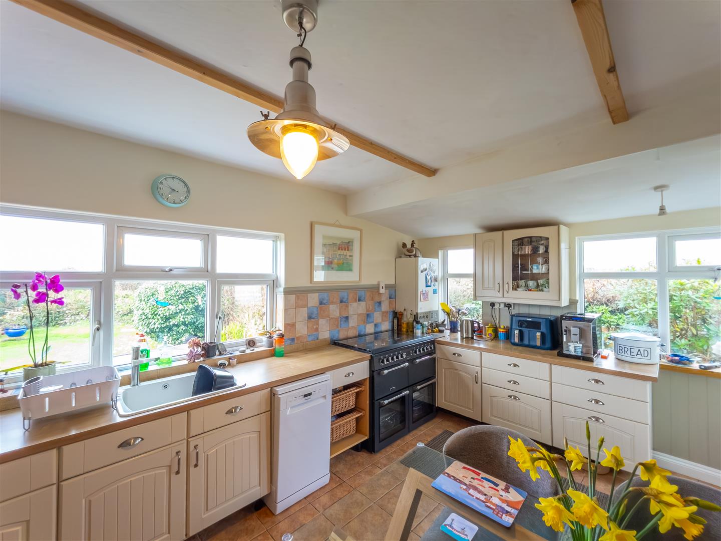 A bright dual aspect room with windows to side and rear fitted with base and wall units with work surfaces over and ceramic sink with mixer tap, space and point for gas oven, free standing butcher block style unit providing for additional storage and work surface space, space and point for under counter fridge freezer.
